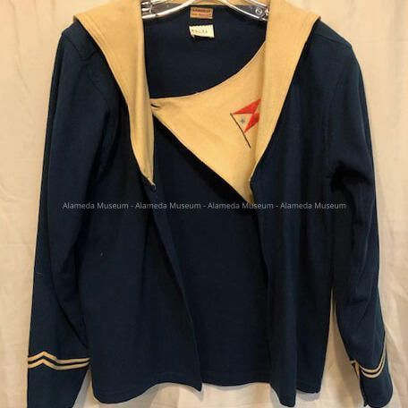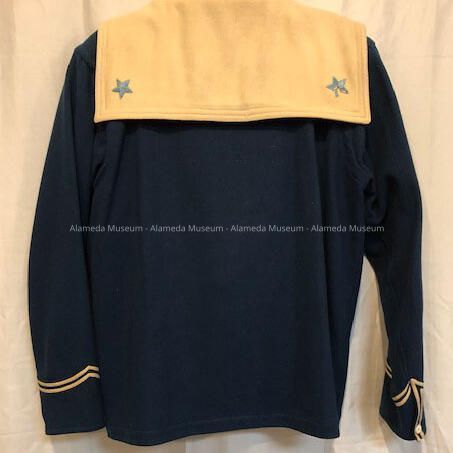 This uniform, derived from the Navy Uniform, shows the typical navy color, parallel stripes, and sailor's collar, but has a 'dickie' (also spelled dickey / dicky tuxedo-front) underneath.