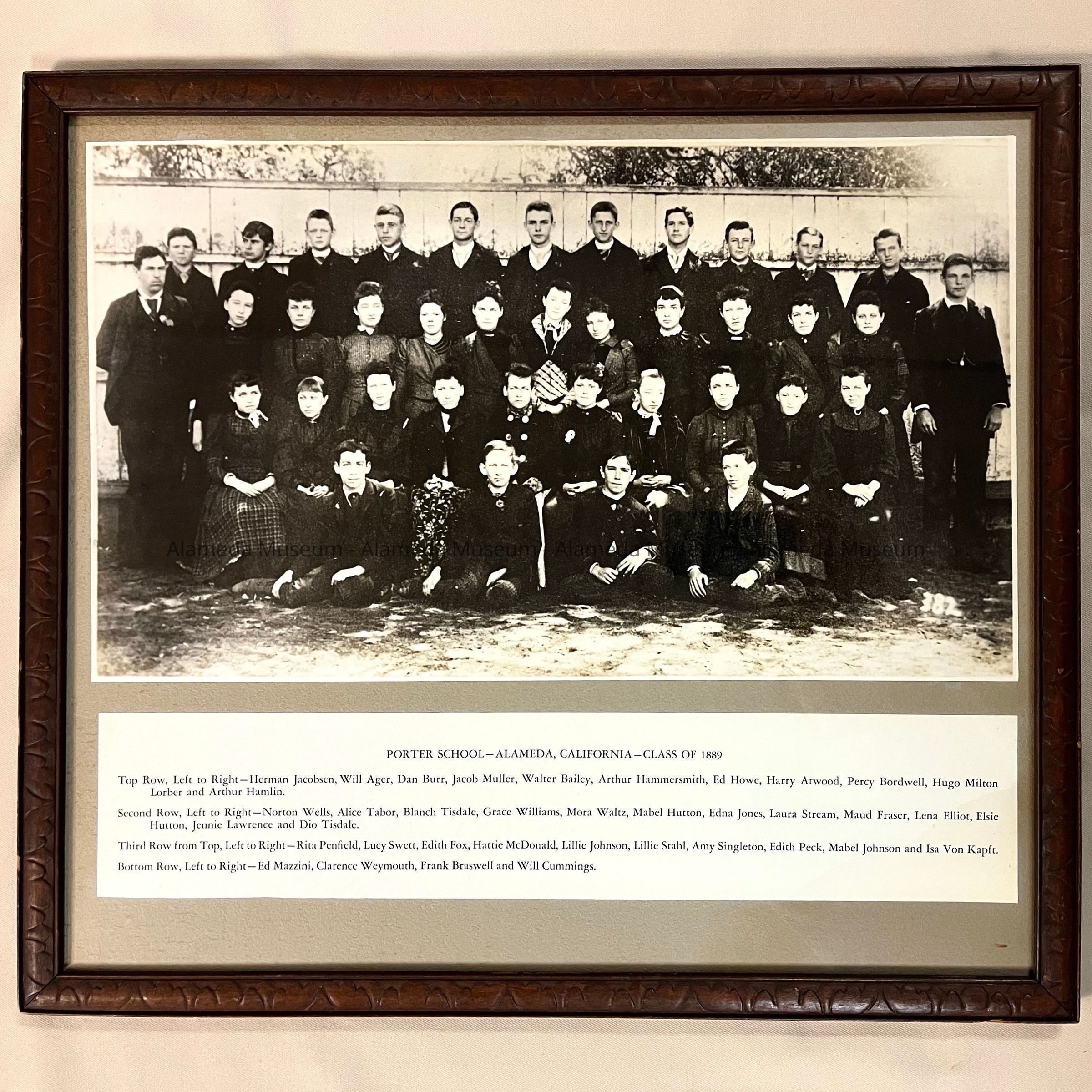 History of Object: Enlarged framed photographic copy of a vintage image of the Porter School Class of 1889. Also included are the names of the students This object was given to the Alameda Historical Society by John Lorber, a member of a pioneer east end Alameda family; his home was located at the present site of St. Philip Neri Church at High Street and Van Buren Street. Included in the photo is a family member, Hugo Milton Lorber.