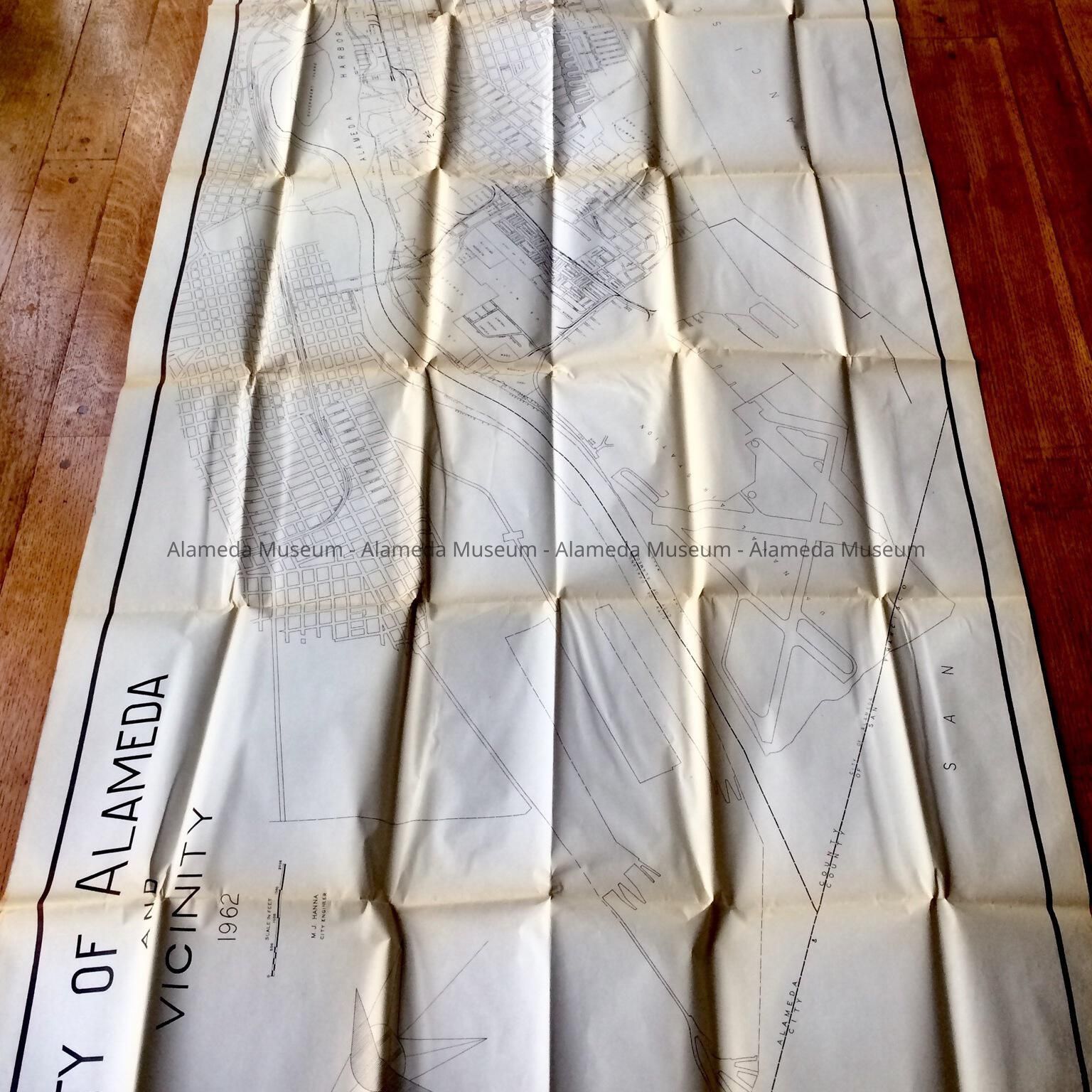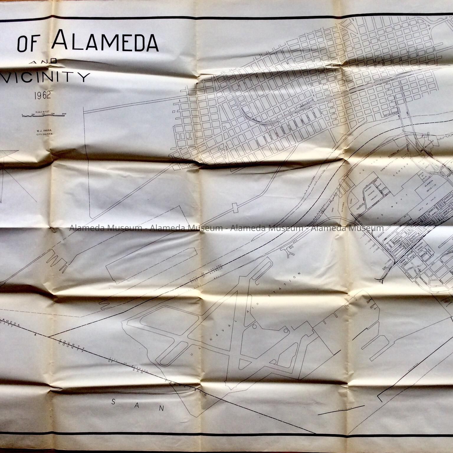 LARGE-SCALE PRINTED MAP IN BLUE-COLORED TYPE, WITH BOLD CAPTION, "CITY OF ALAMEDA AND VICINITY, 1962."