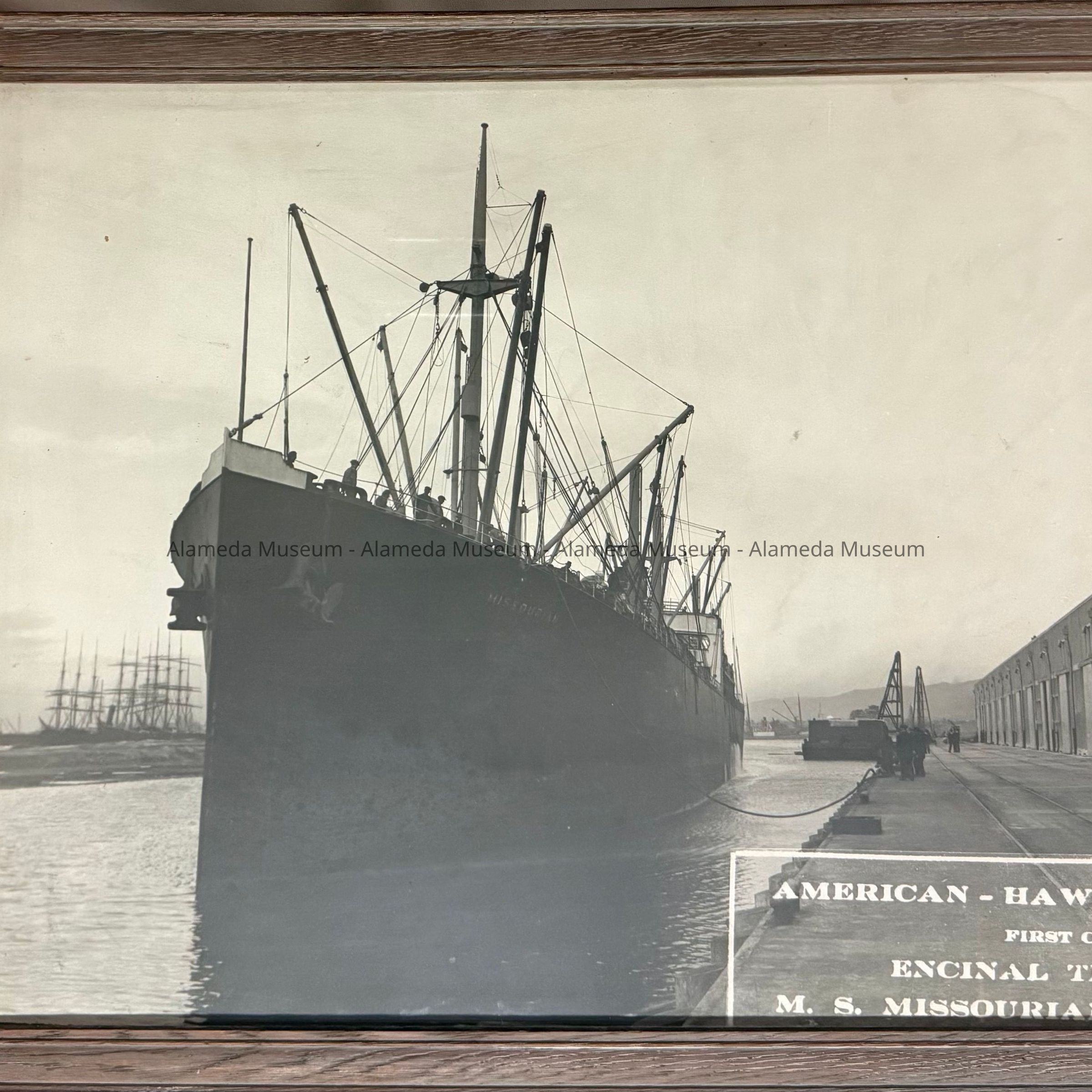 DESCRIPTION: AN ENLARGED BLACK-AND-WHITE PHOTOGRAPH WITHOUT GLASS, IN AN OAK FRAME WITH A GRAY RINSE. THE PHOTOGRAPH HAS A CAPTION IN BLOCK LETTERS, "AMERICAN-HAWAIIAN S. S. CO'S." "ENCINAL TERMINAL, M.S. MISSOURIAN, FEBRUARY 10, 1925."