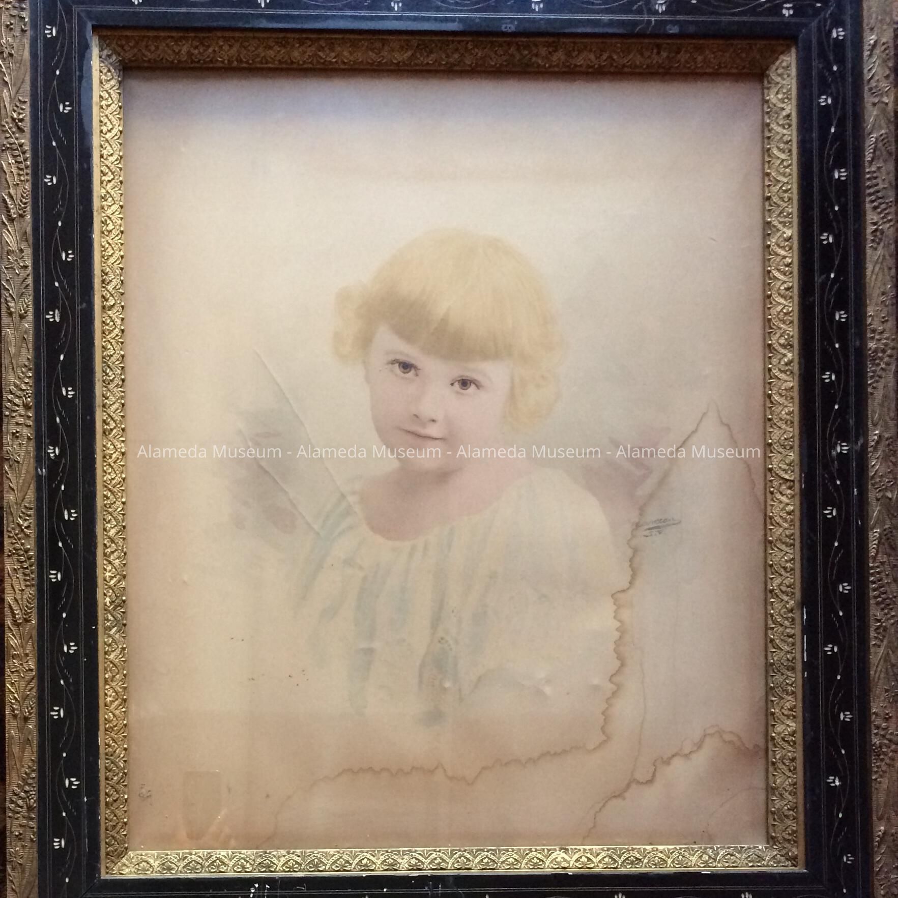 History of Object: Photographic portrait, circa 1897, of Myrtle Fisher, born Alameda, 1890, graduated Alameda High School, 1908. She was the daughter of Bertrand L. Fisher (of Combs & Fisher, Park Street merchants). She married Sydney Wilson, and had two children, Jean Lorraine & Robert A. Wilson. Her mother, Cora Combs, married Bertrand L. Fisher, and had two children daughter (Herald and Myrtle). Cora Combs was the daughter of Milton Combs, died Alameda, 1873, an early Justice-of-the-Peace.