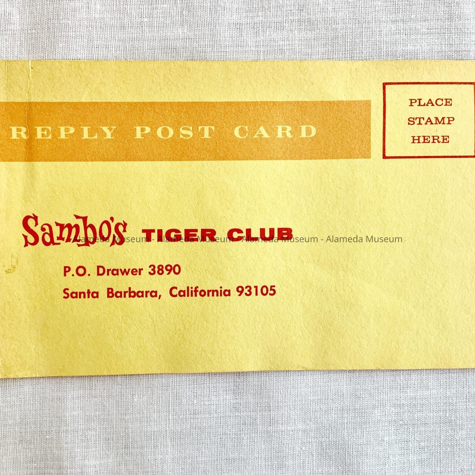 History of Object: A Sambo's Tiger Club enrollment postcard, distributed by the Sambo's Restaurant located on Webster Street, Alameda.