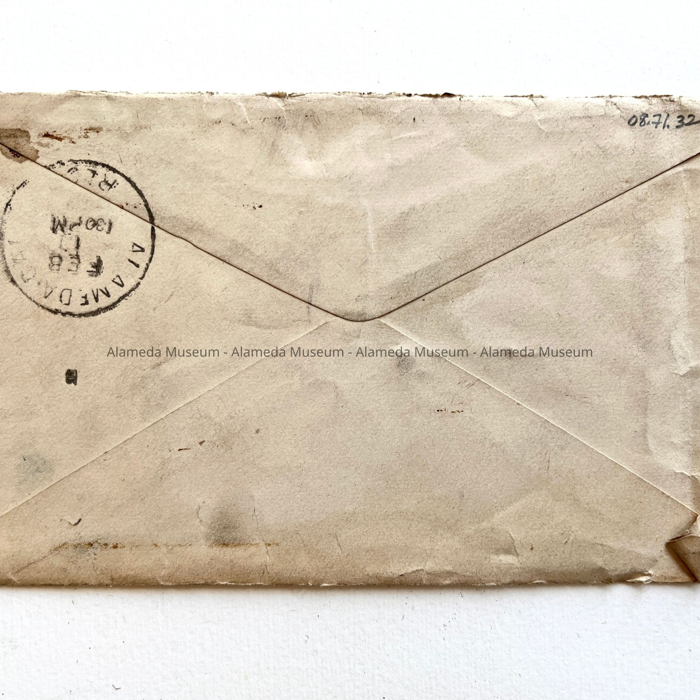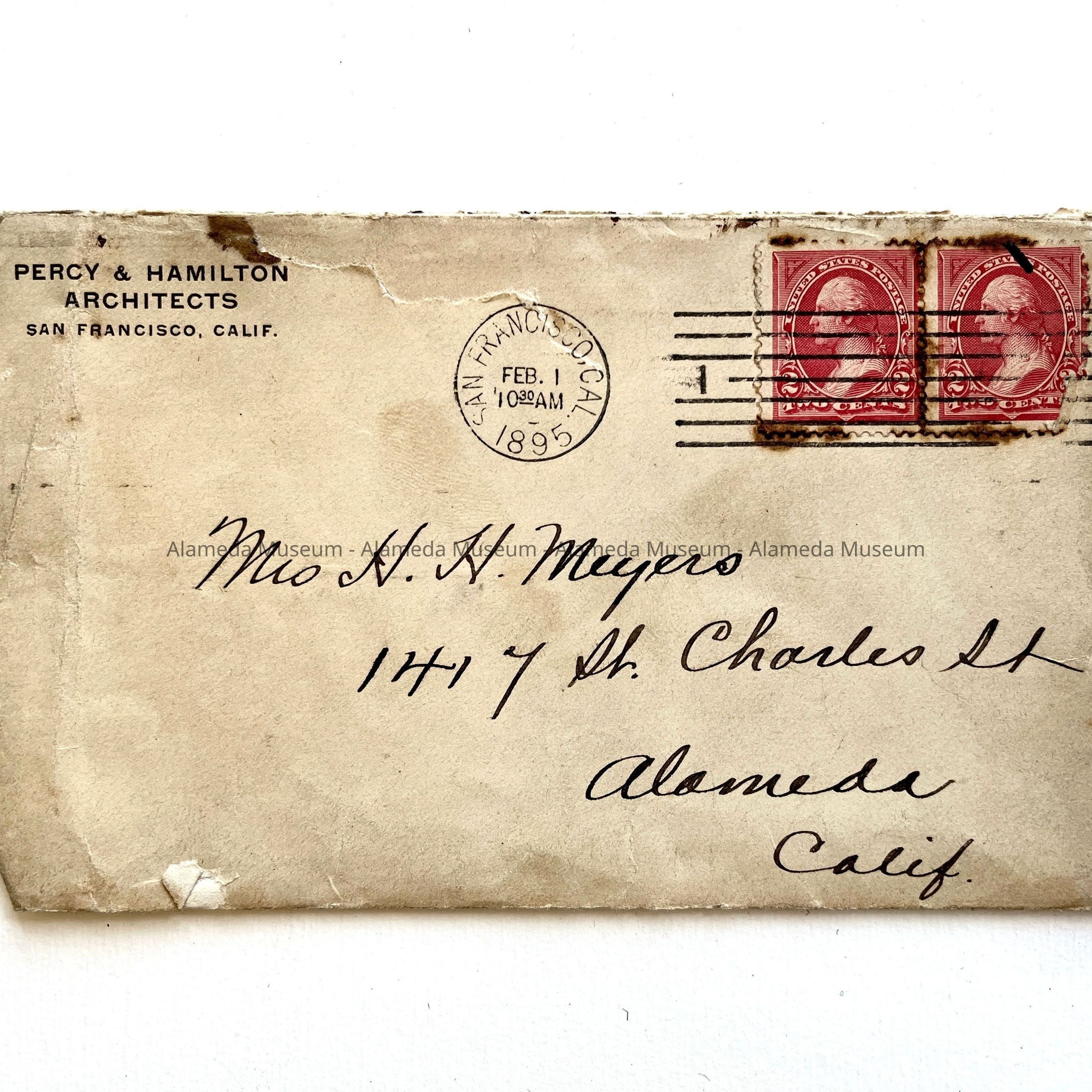 AN ENVELOPE ADDRESSED TO MRS HENRY H MEYERS, 1417 SAINT CHARLES STREET, ALAMEDA. 1417 SAINT CHARLES STREET WAS A RENTAL HOUSE IN WHICH MR AND MRS MEYERS RESIDED FOLLOWING THEIR MARRIAGE IN 1894. THEY OCCUPIED THAT HOME UNTIL 1897 WHEN THEIR HOUSE @ 2021 ALAMEDA AVENUE WAS COMPLETED. THE RETURN ADDRESS ON THE ENVELOPE STATES, "PERCY & HAMILTON, ARCHITECTS, SAN FRANCISCO, CALIF." THAT FIRM EMPLOYED HENRY H MEYERS AS A DRAFTSMAN AT THE BEGINNING OF HIS CAREER. HENRY ULTIMATELY TOOK OVER THE FIRM AFTER THE PRINCIPAL ARCHITECT HAD DIED IN EITHER 1899 OR 1900.