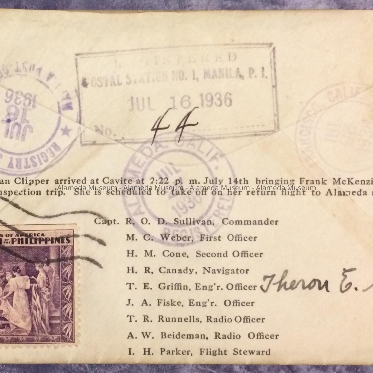 Sent on a historic fifteenth flight from Cavite, P.I. to Alameda, via Guam, Wake Island, Midway Island and Honolulu, 1936.