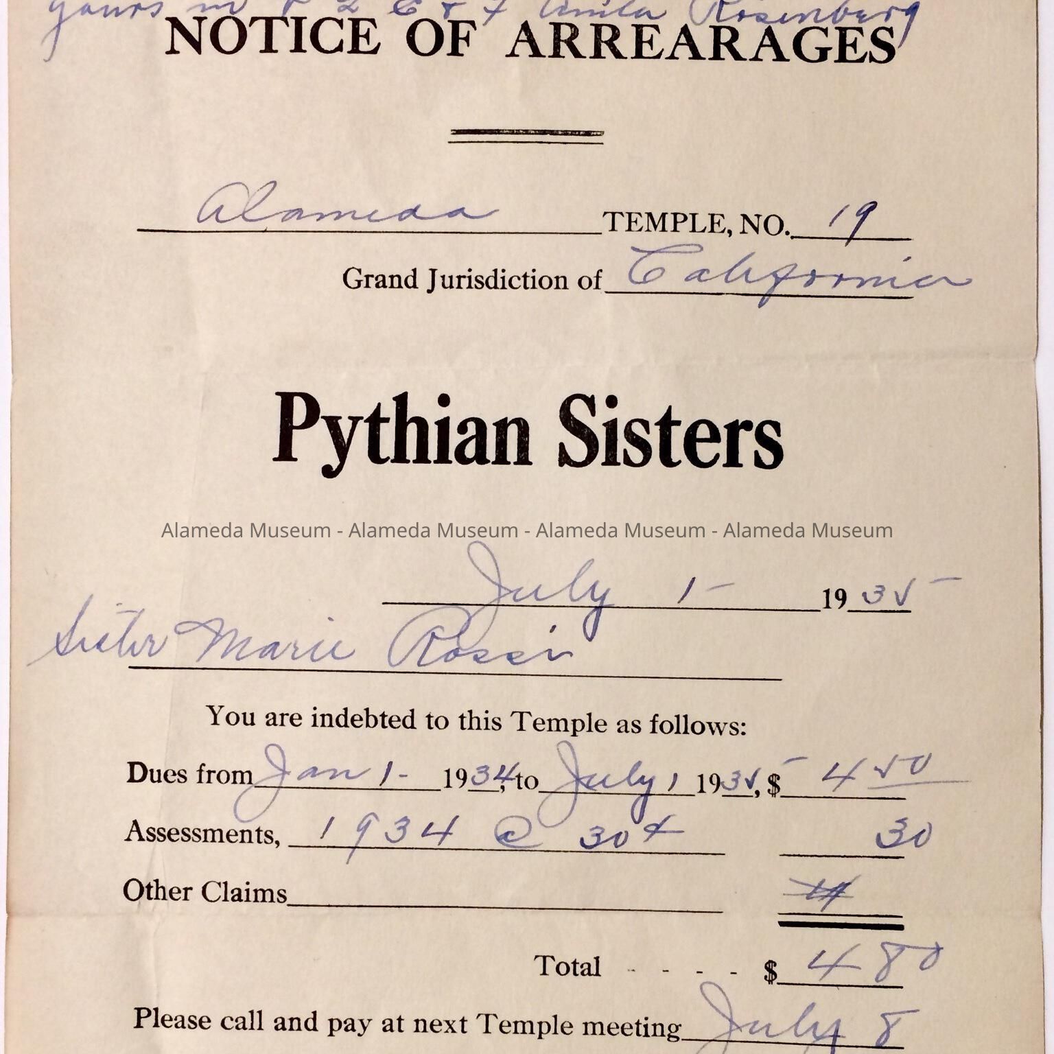 B. Form with blanks filled in with hand written information in a blue fountain pen, with heading 'Notice of Arrearages', and 'Alameda Temple, No. 19, Pythian Sisters, July 1 1935', from Anita Rosenburg, M. of F. With imprinted seal.