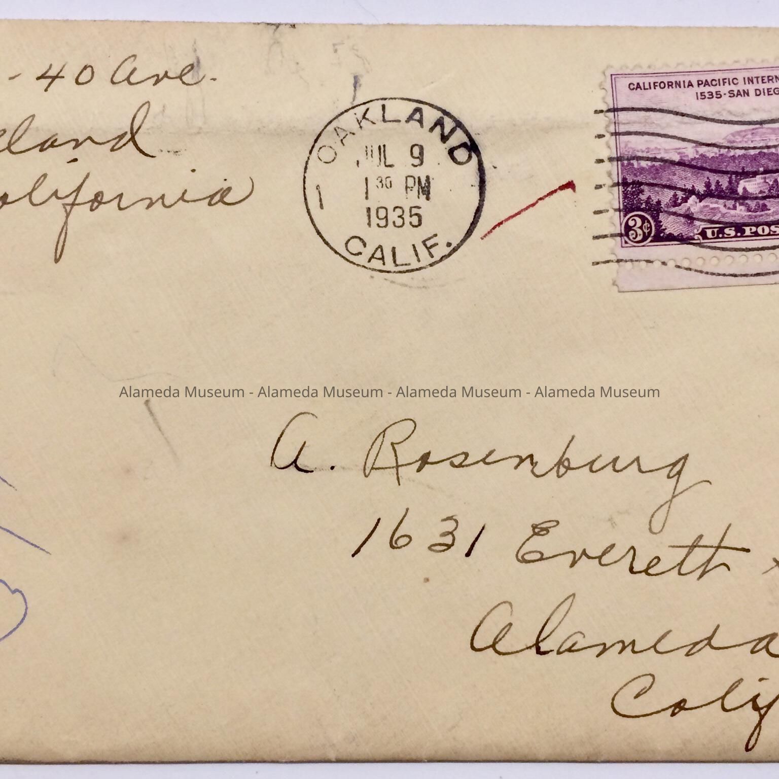 A. Envelope, addressed in black ballpoint pen to A. Rosenburg, 1631 Everett St., Alameda, from 2254 40 Ave, Oakland, with stamp from the California Pacific International Exposition, San Diego, 1935. Post marked Jul 9, 1935