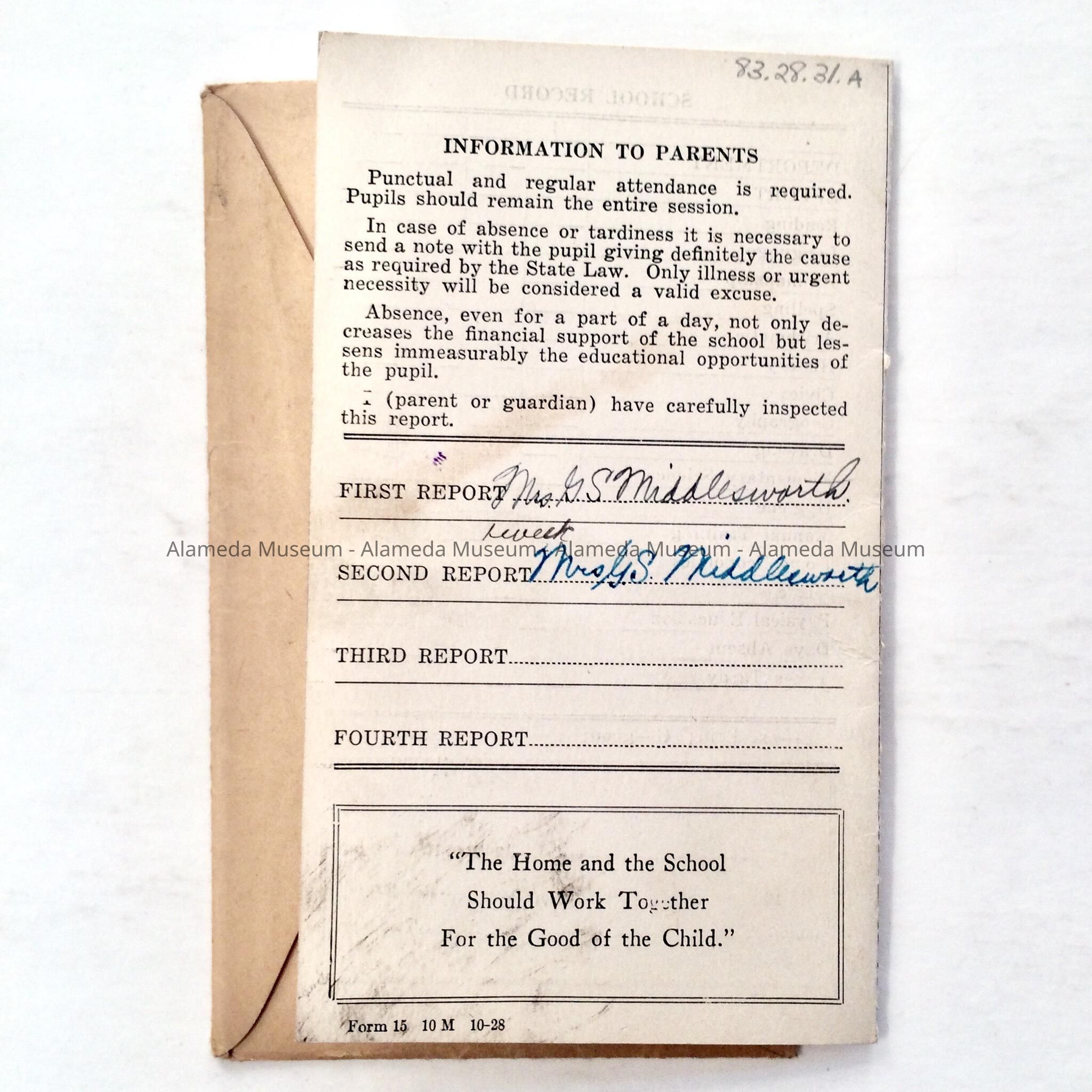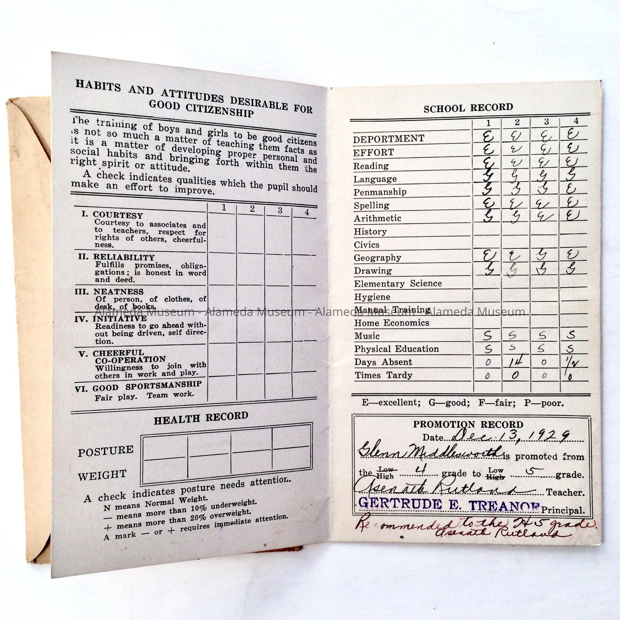 a. booklet type (2 pages) report card, bold caption "Alameda City Schools". Cover- report of, name, grade, etc. Interior, grades, back cover-parent signature. Size, 3½x6 inches