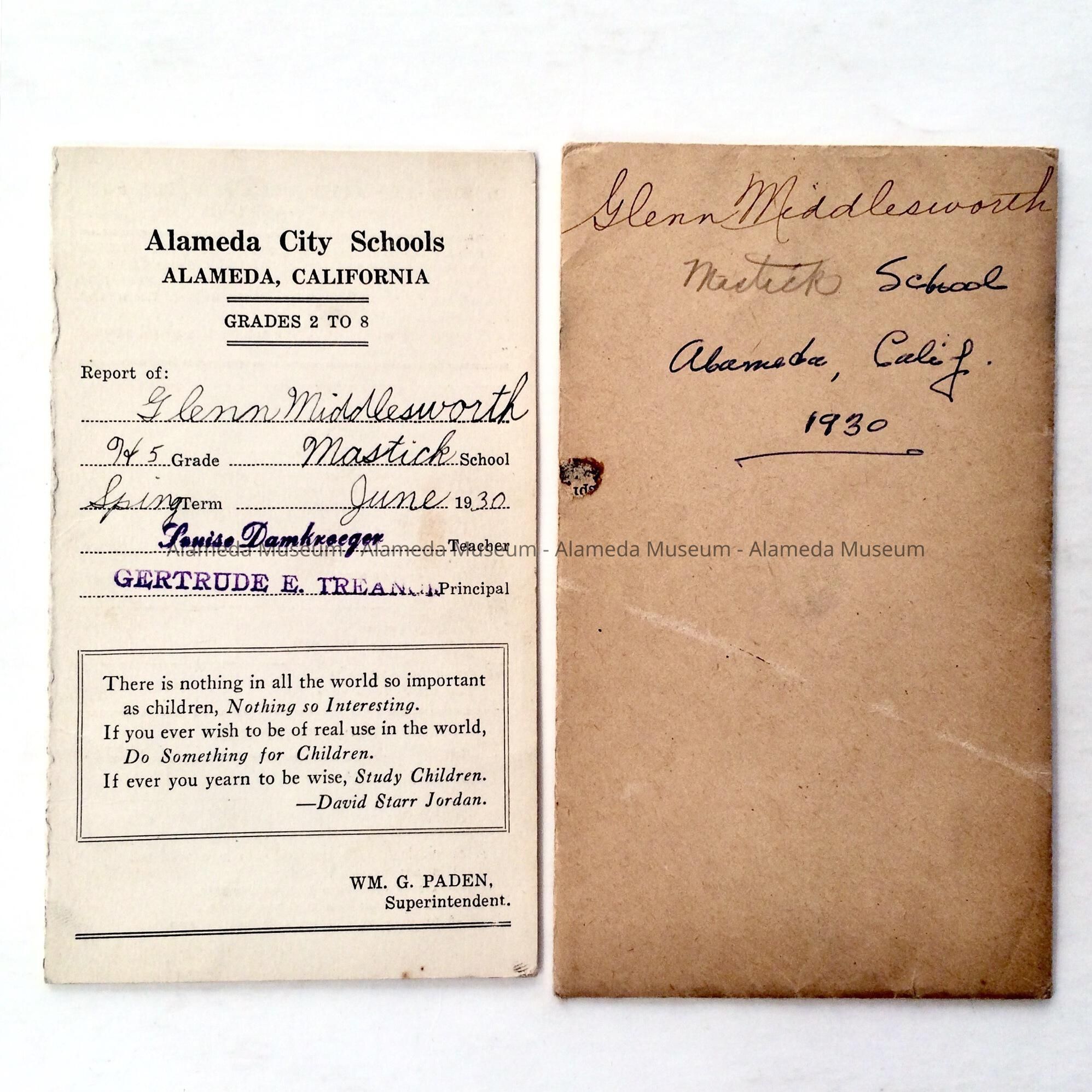 History of Object: Report card & envelope of Glenn Middlesworth, Mastick School, Spring session, 1930.