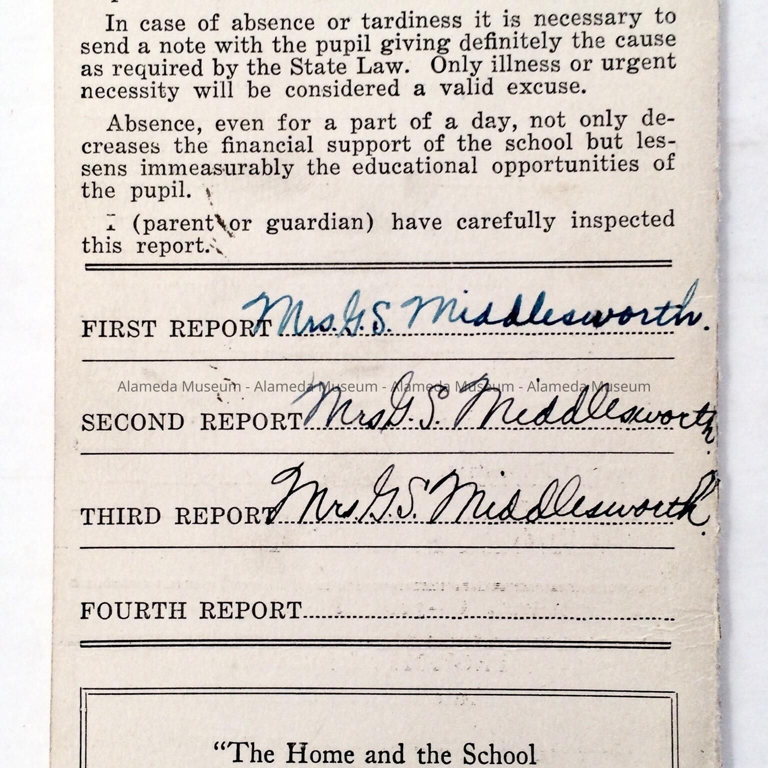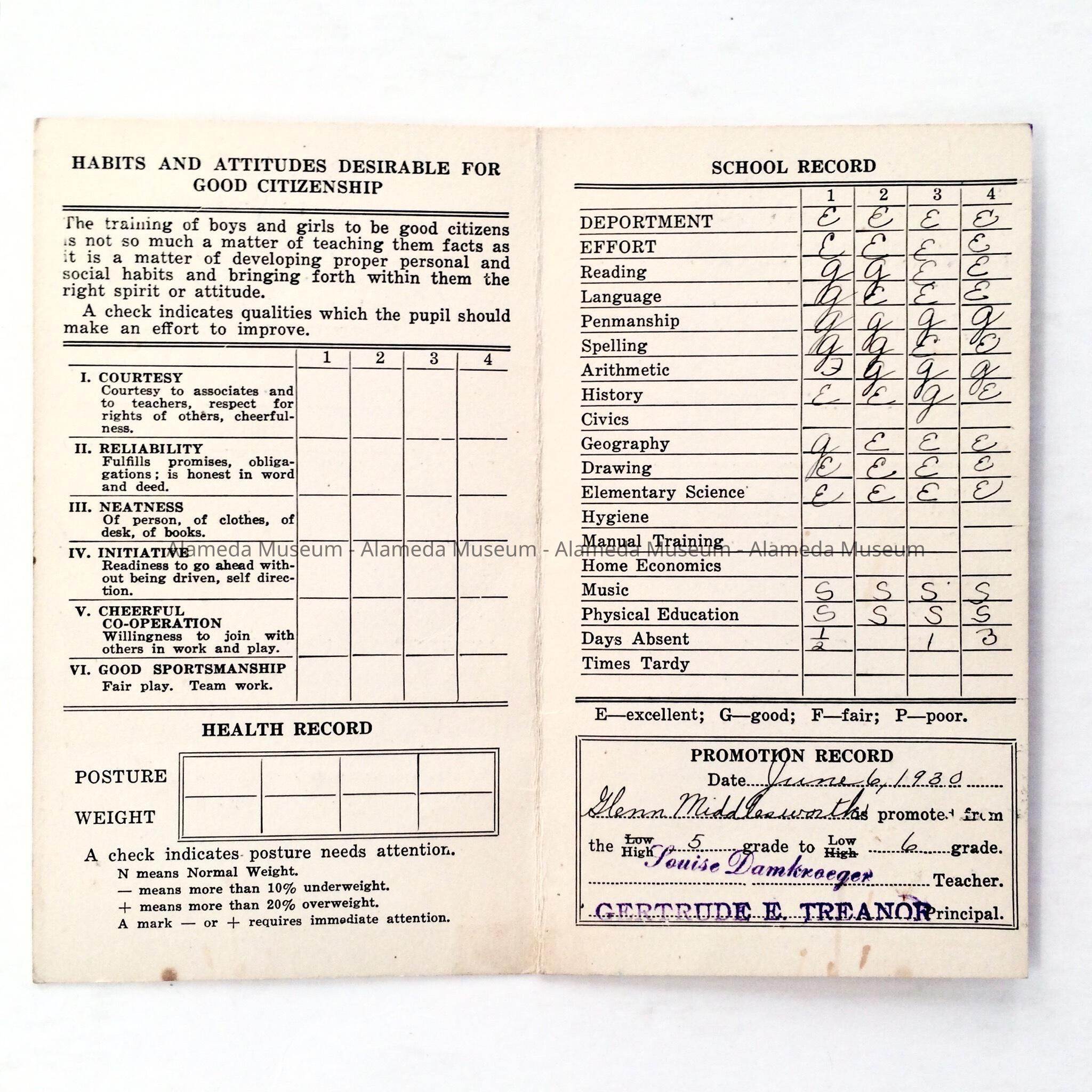 a. booklet type (2 pages) report card, bold caption "Alameda City Schools". Cover- report of, name, grade, etc. Interior, grades, back cover- parent signature.