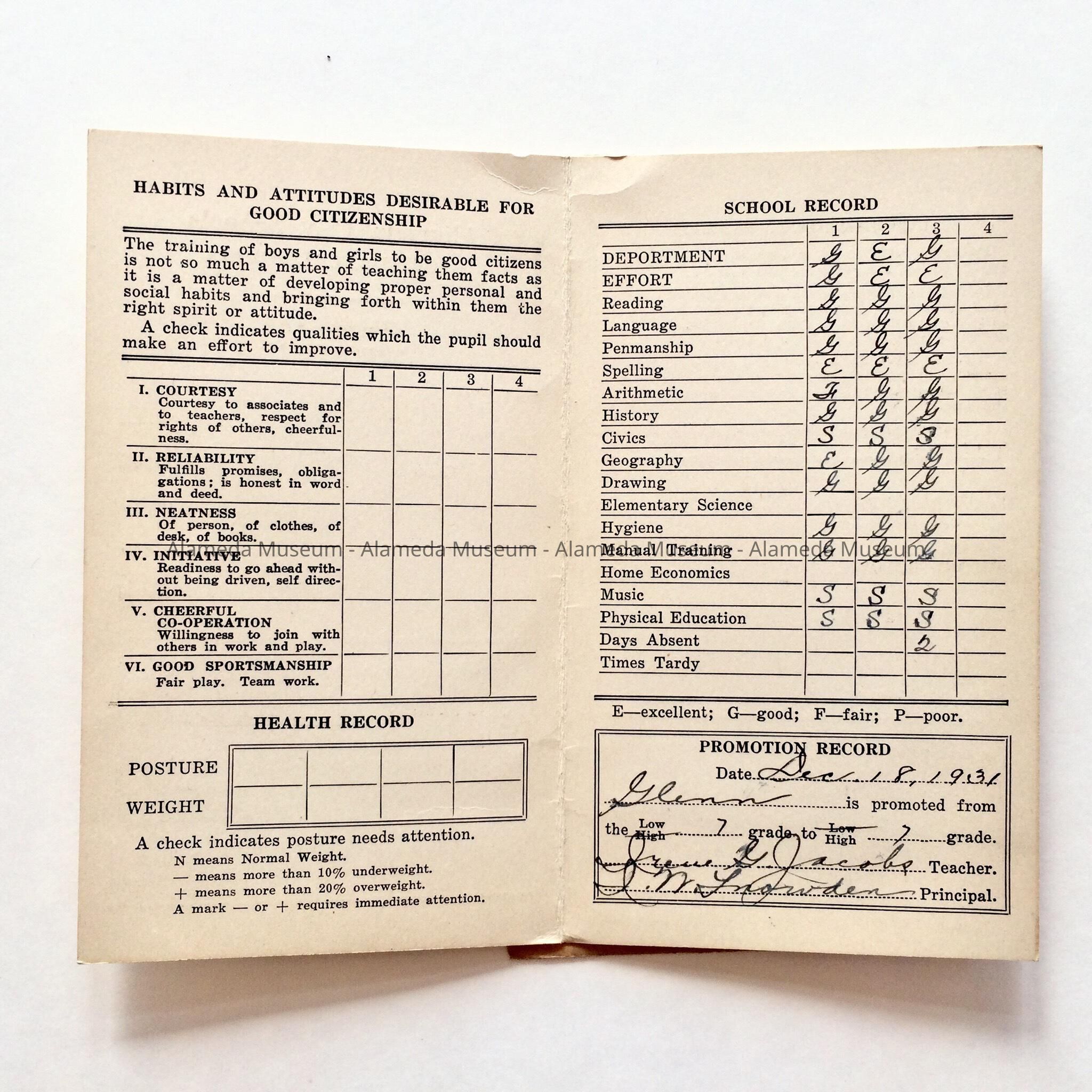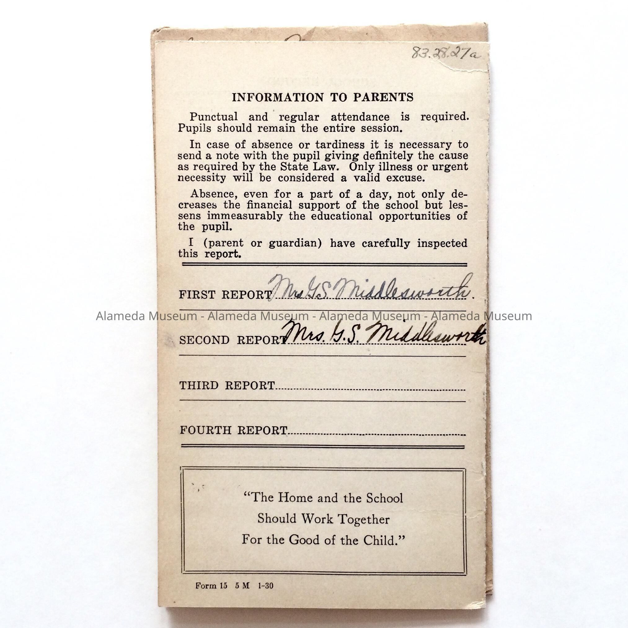 a. booklet type (2 pages) report card, bold caption "Alameda City Schools". Cover-report of, name, grade, etc. Interior, grades, back cover-parent signature.