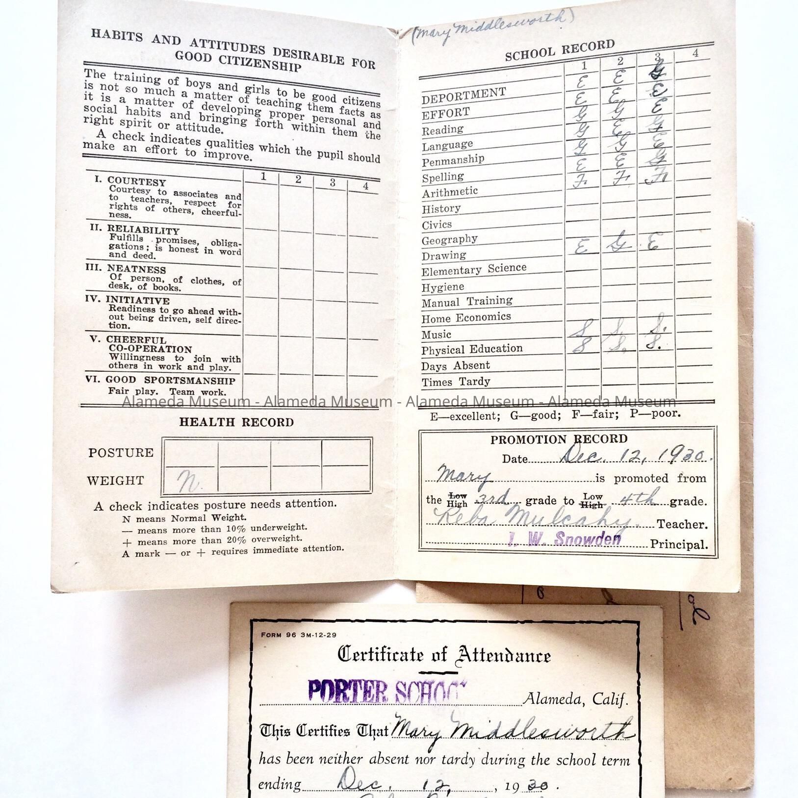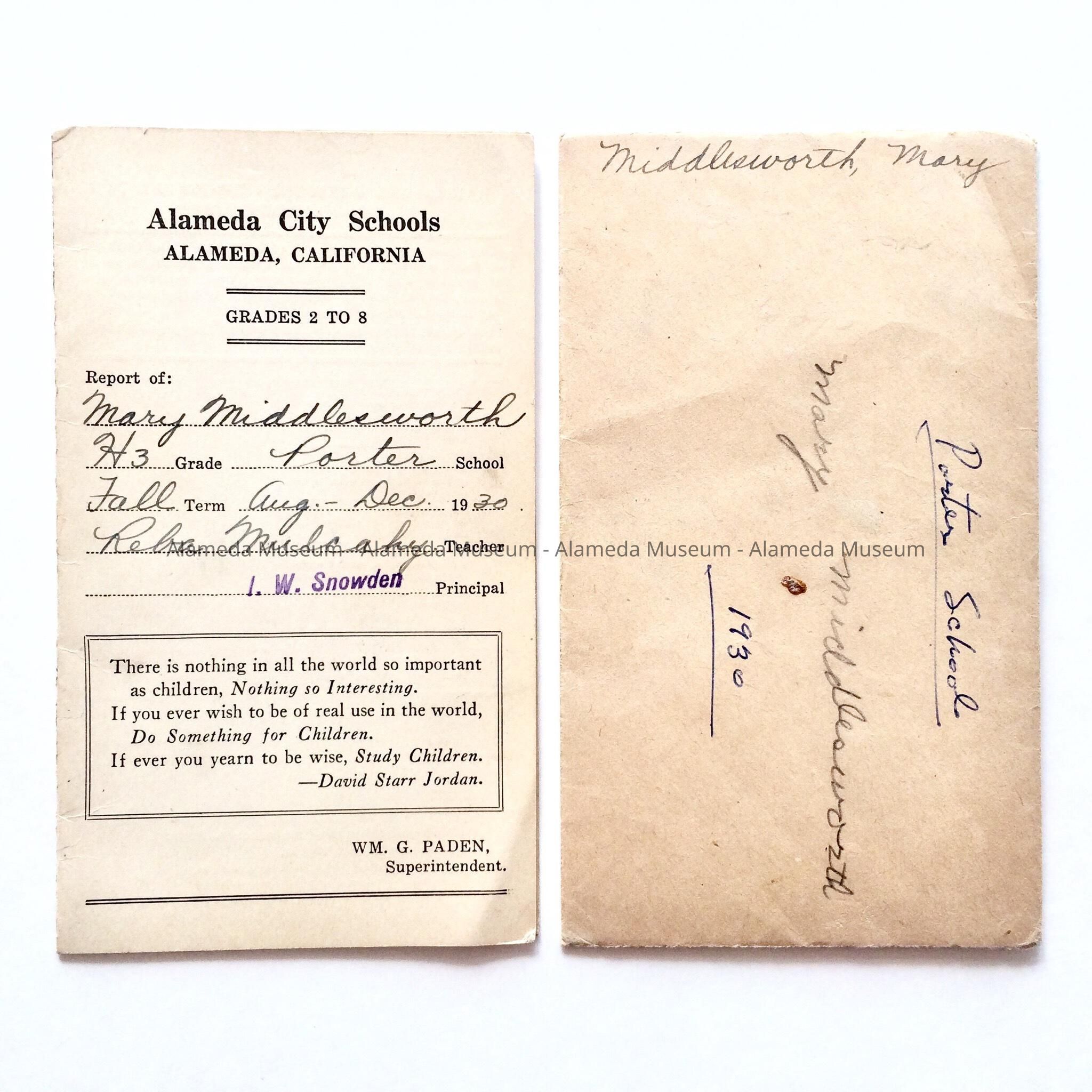 History of Object: Report card & envelope of Mary Middlesworth, Porter School, Fall session, 1930.
