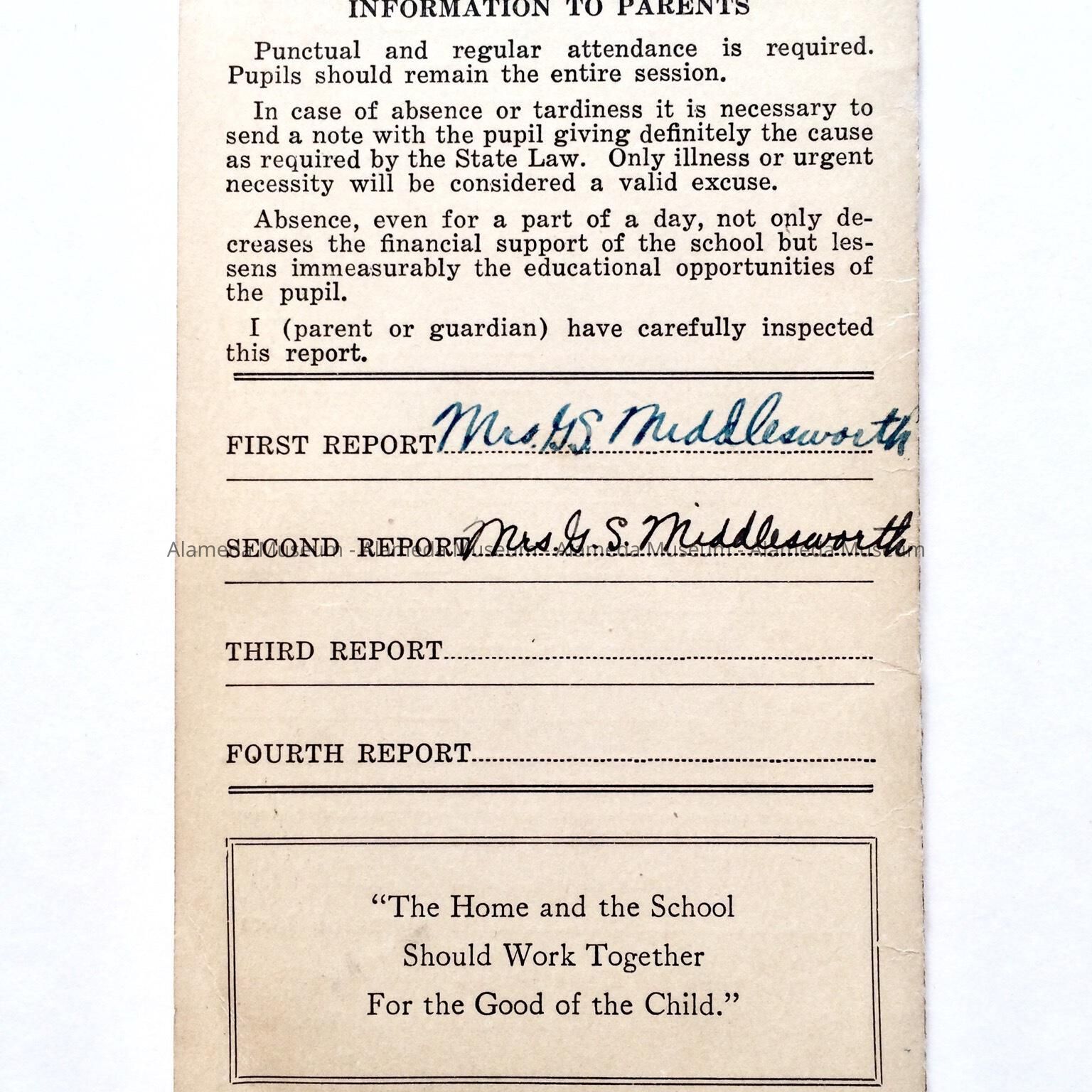 a. booklet type (2 pages) report card, bold caption "Alameda City Schools". Cover- report of, name, grade, etc. Interior, grades, back cover- parent signature.