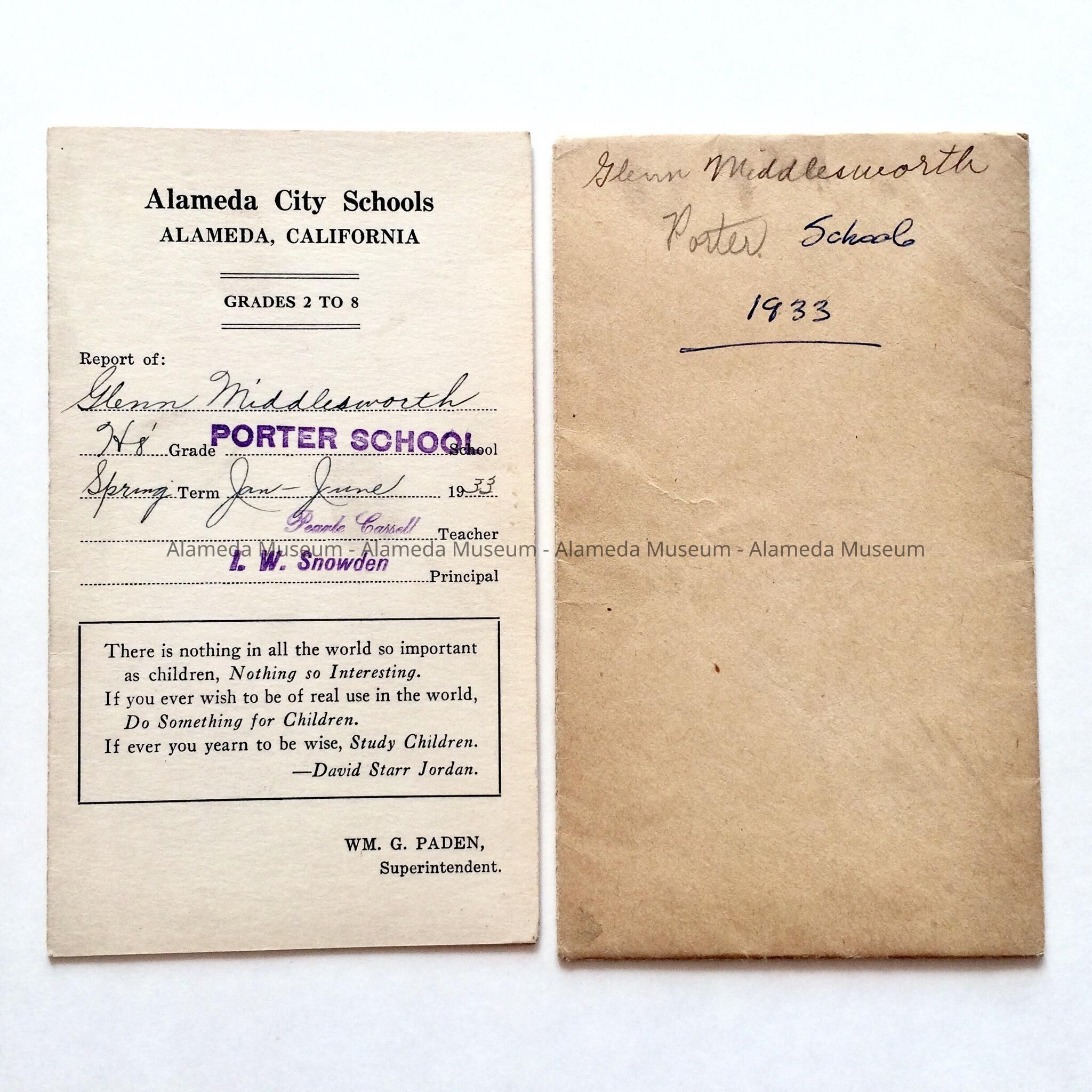History of Object: Report card & envelope of Glenn Middlesworth, Porter School, Spring session, 1933.