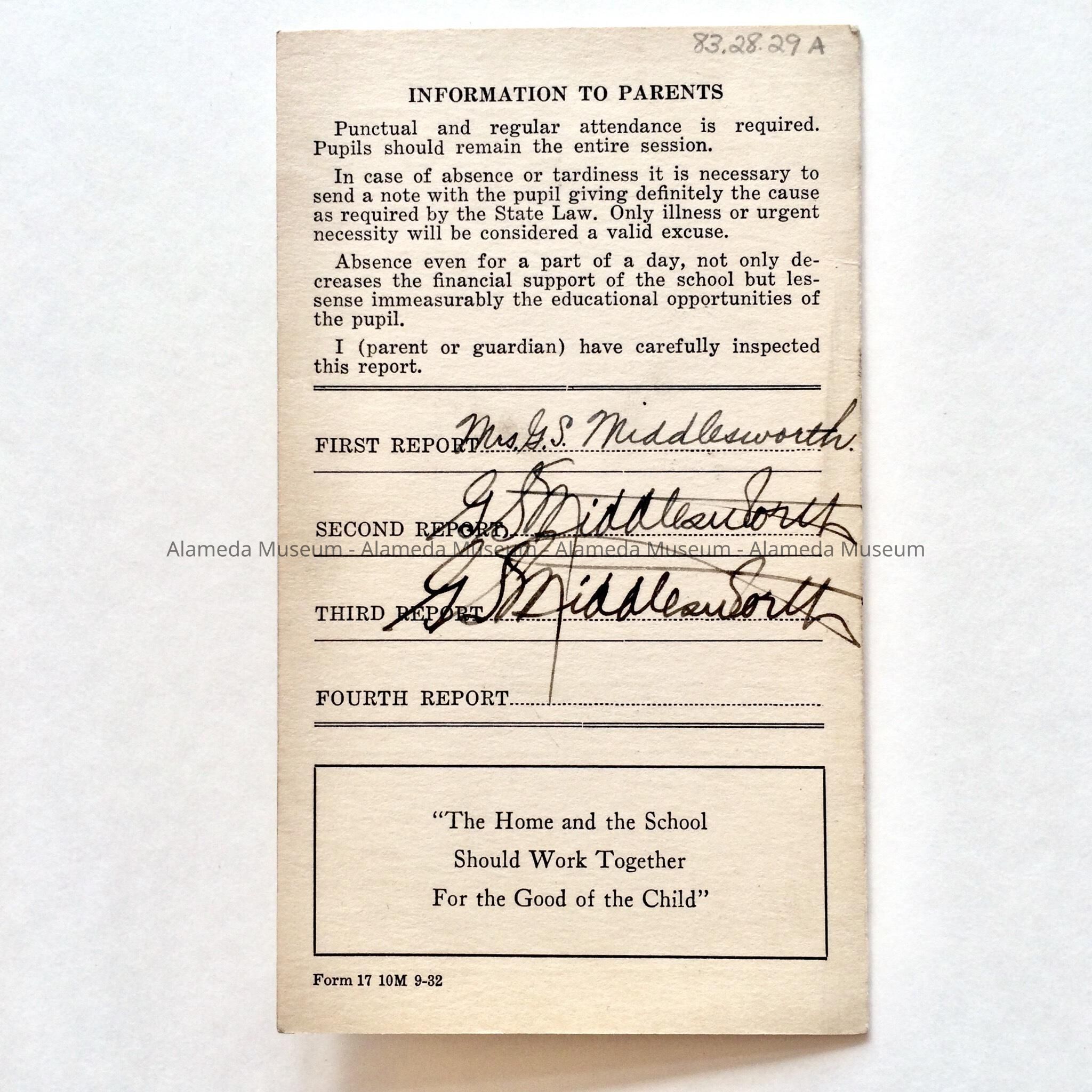 a. booklet type (2 pages) report card, bold caption "Alameda City Schools". Cover- report of, name, grade, etc. Interior, grades, back cover- parent signature.