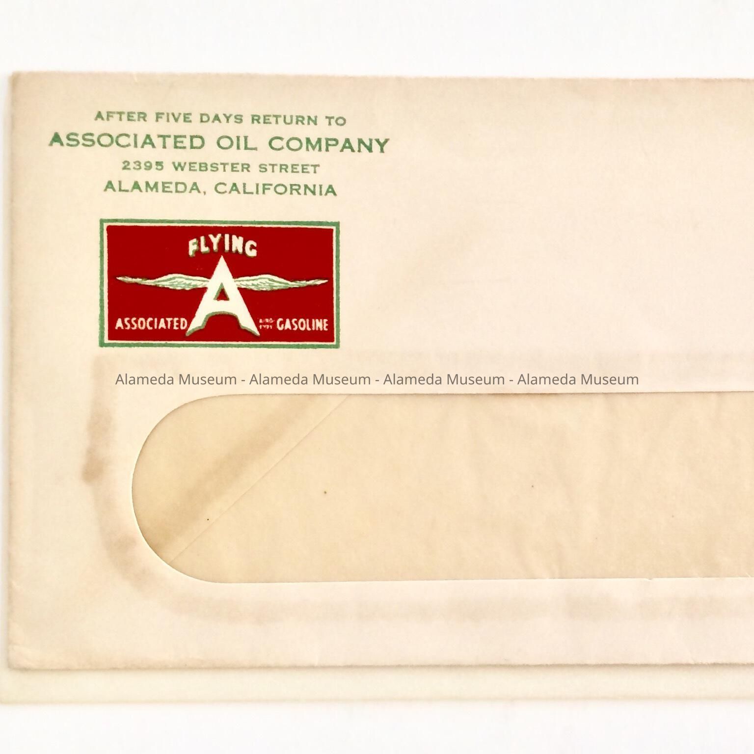 AN ENVELOPE FROM THE ASSOCIATED OIL CO., 2395 WEBSTER ST, ALAMEDA, CALIF. ENVELOPE ALSO HAS THE OFFICIAL LABEL OF THE COMPANY, DEPICTING A CAPITAL LETTER "A" WITH WINGS.