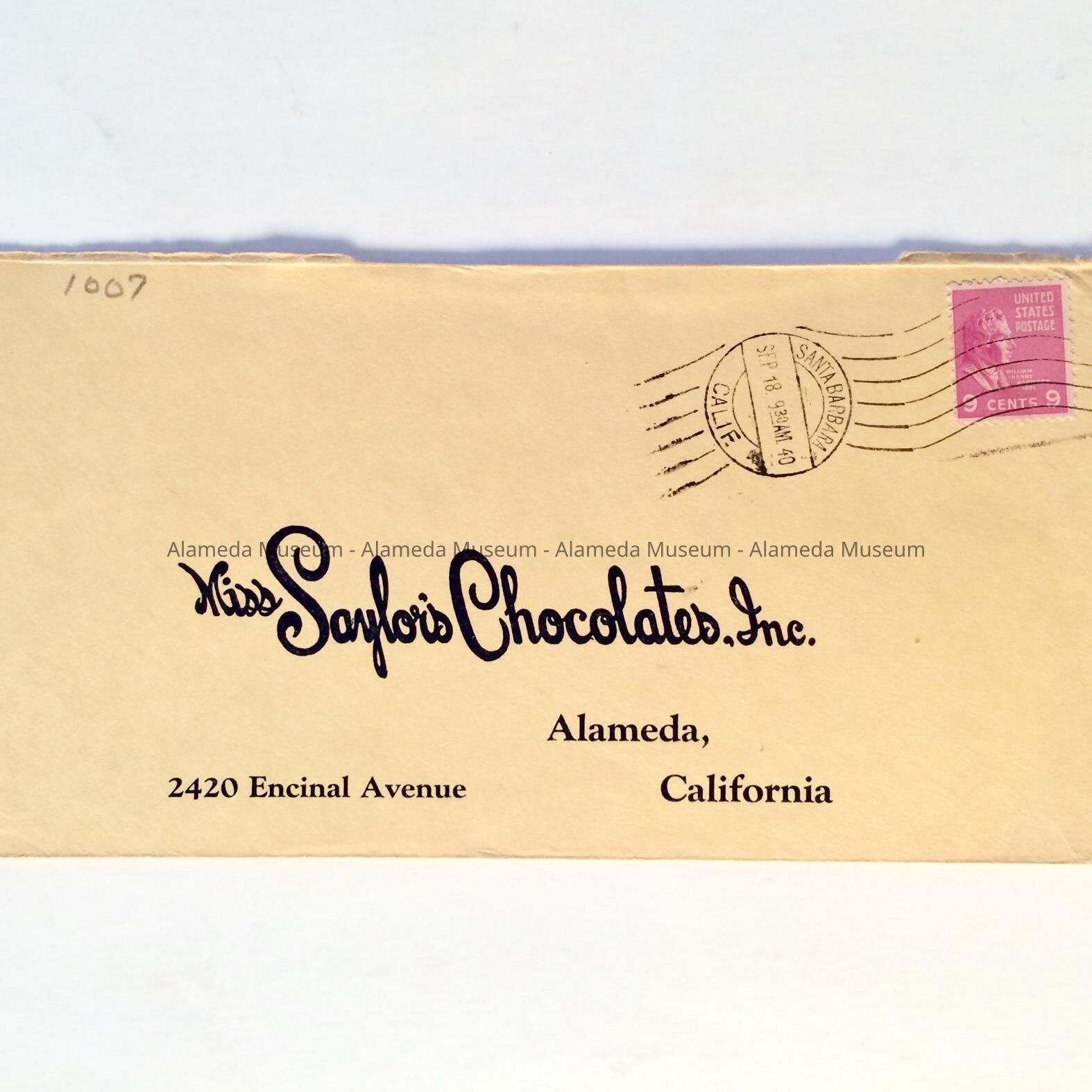 HISTORY OF OBJECT: A SELF-ADDRESSED ENVELOPE POSTMARKED 9-18-1940 FROM MISS SAYLOR'S CHOCOLATES, INC., 2420 ENCINAL AVENUE, ALAMEDA.