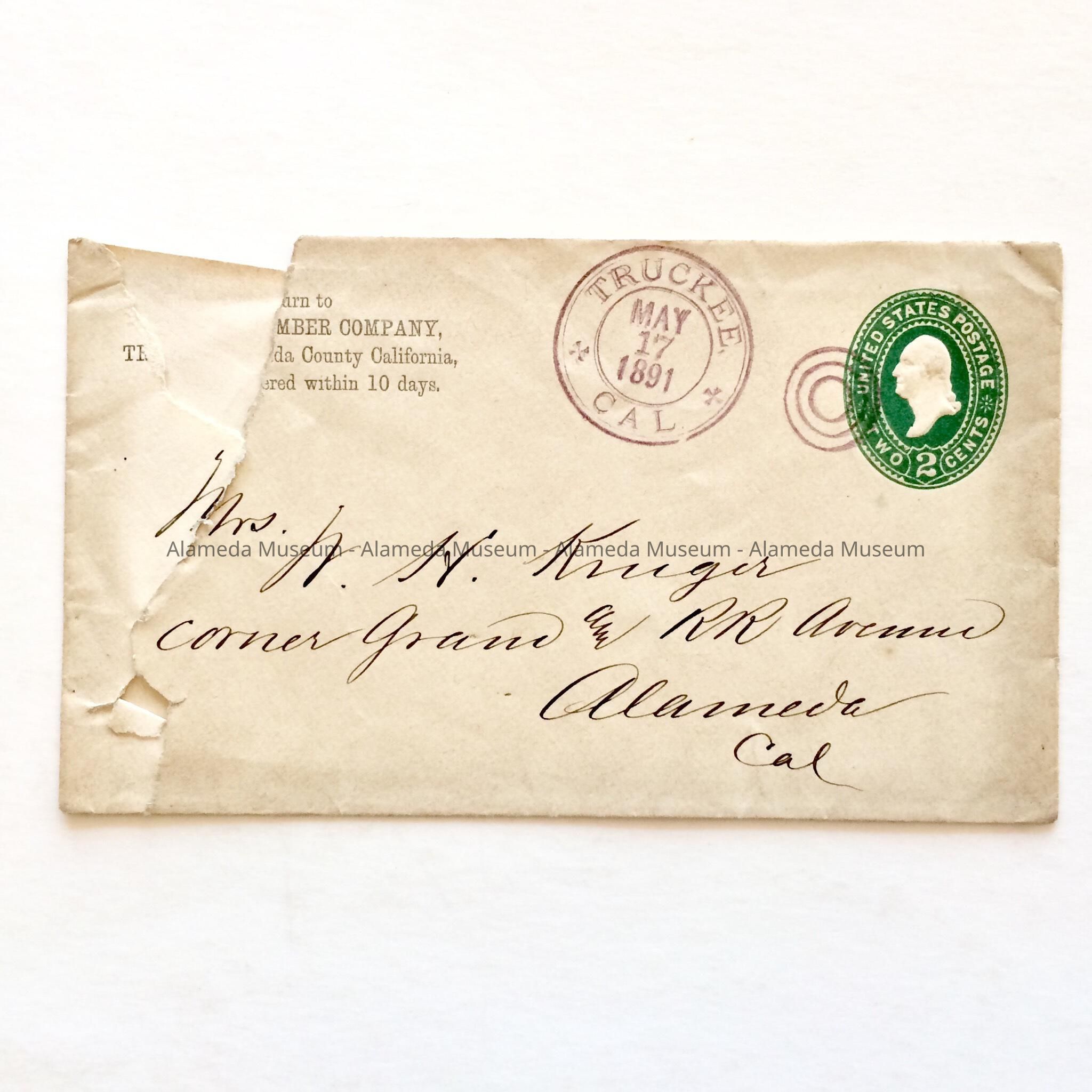 History of Object: Envelope addressed to Mrs. W. H. Kruger, corner Grand & Railroad Avenue, Alameda, Cal., and postmarked May 17, 1891. The envelope (letter missing) was sent from Mr. Kruger (Truckee Lumber Co., Truckee, California) to his wife (a resident of Alameda).