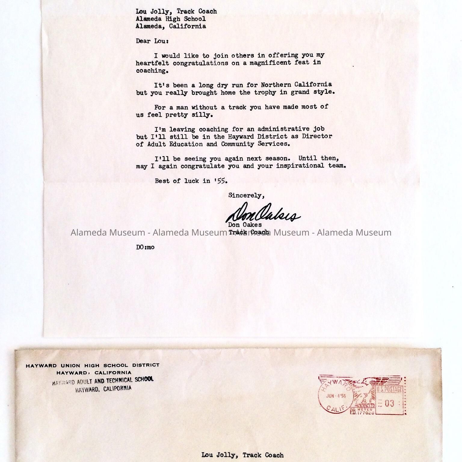A LETTER ADDRESS TO LEWIS C JOLLEY, TRACK COACH, ALAMEDA HIGH SCHOOL, CONGRATULATING HIM ON THE VICTORY OF HIS RUNNERS. LETTER WAS SIGNED BY DON OAKES, TRACK COACH, HAYWARD HIGH SCHOOL.