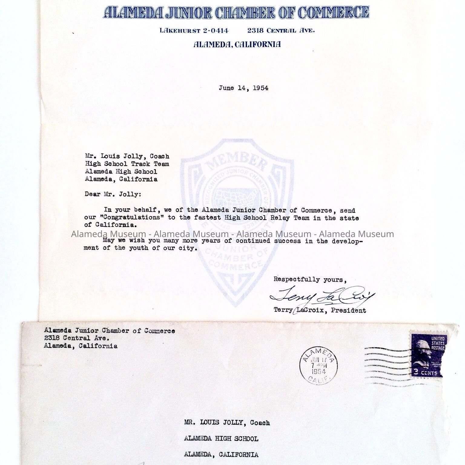 A LETTER ADDRESSED TO LEWIS C JOLLEY, COACH, AHS, COMMENDING HIM FOR THE RECORD OF THE FASTEST RELAY TEAM IN CALIFORNIA. LETTER WAS SENT BY THE ALAMEDA JUNIOR CHAMBER OF COMMERCE, AND SIGNED BY TERRY LA CROIX, PRESIDENT. TERRY LATER BECAME MAYOR OF ALAMEDA.