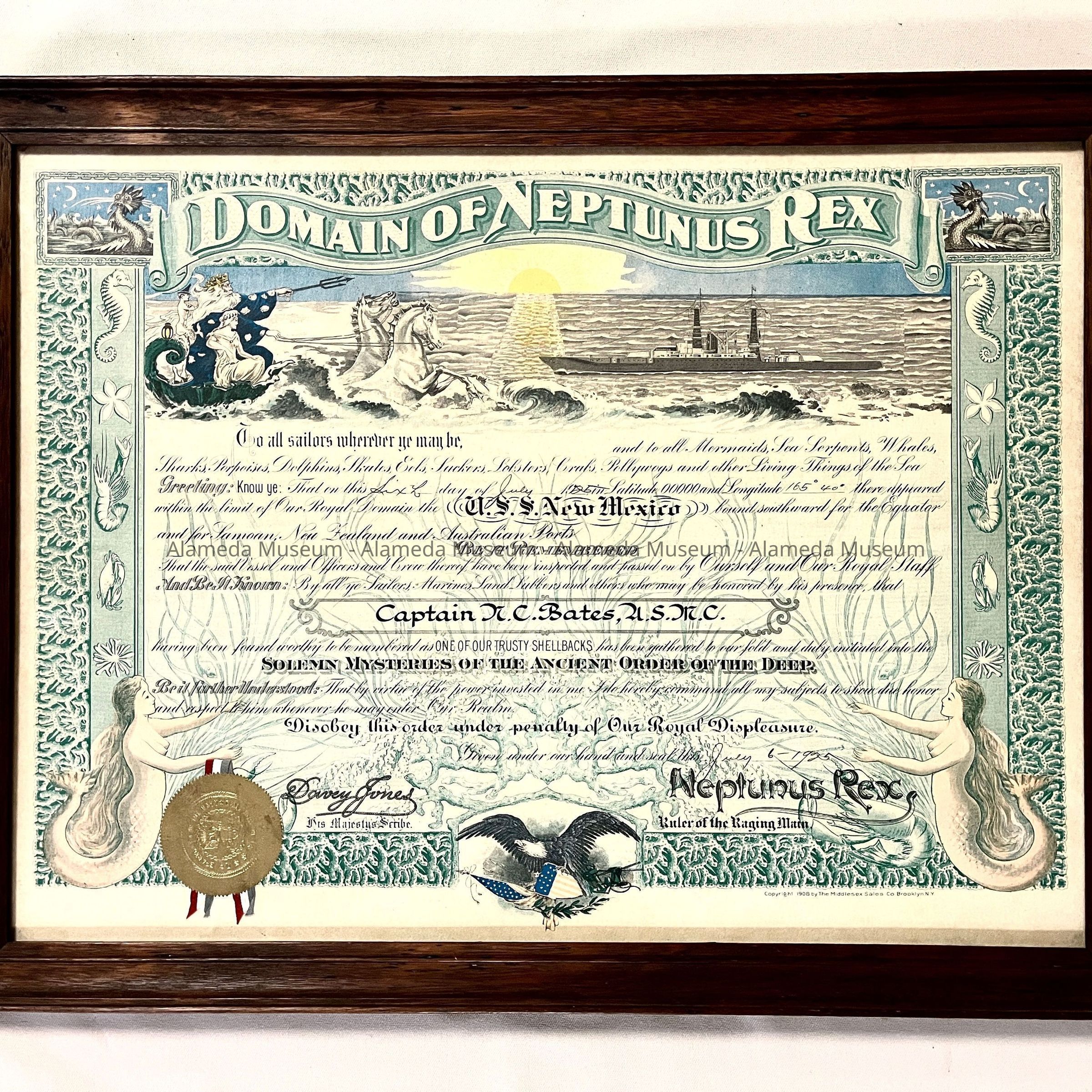 History of Object: Certificate awarded to Captain N. C. Bates, USMC, aboard the USS New Mexico, as it crossed the Equator on July 6, 1925. Captain Bates was a member of a prominent early family of Alameda which resided at 727 Paru St. One of his brothers married the late Martha Linderman whose grandfather was engineer for the Artesia Water Company located on Thompson Avenue. Her father owned an opera house on Central Ave. (near Park St.) which burned down in 1897.