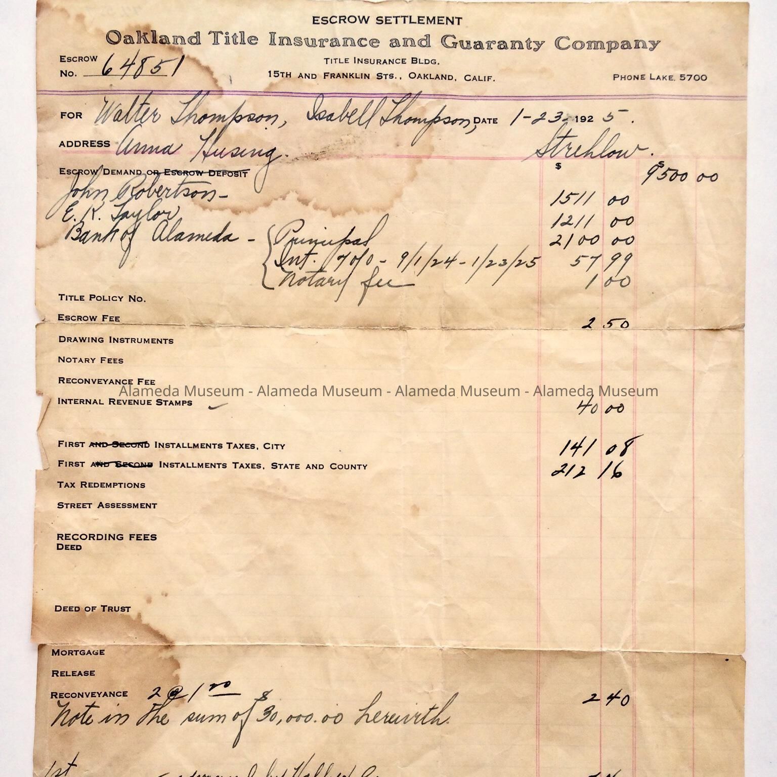 HISTORY OF OBJECT: ESCROW SETTLEMENT SHEET CONCERNING LAND OWNED BY WALTER & ISABELL THOMPSON (SURF BEACH PROPERTY) TO MR. STREHLOW, FOR THE DEVELOPMENT OF NEPTUNE BEACH.