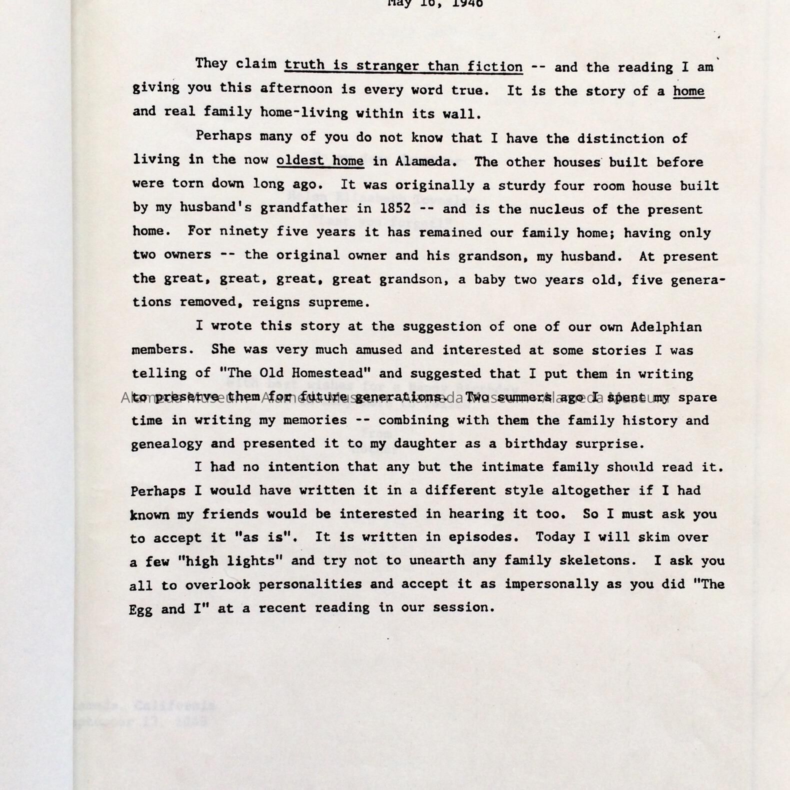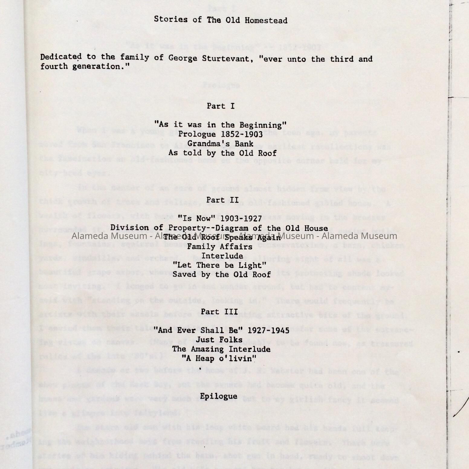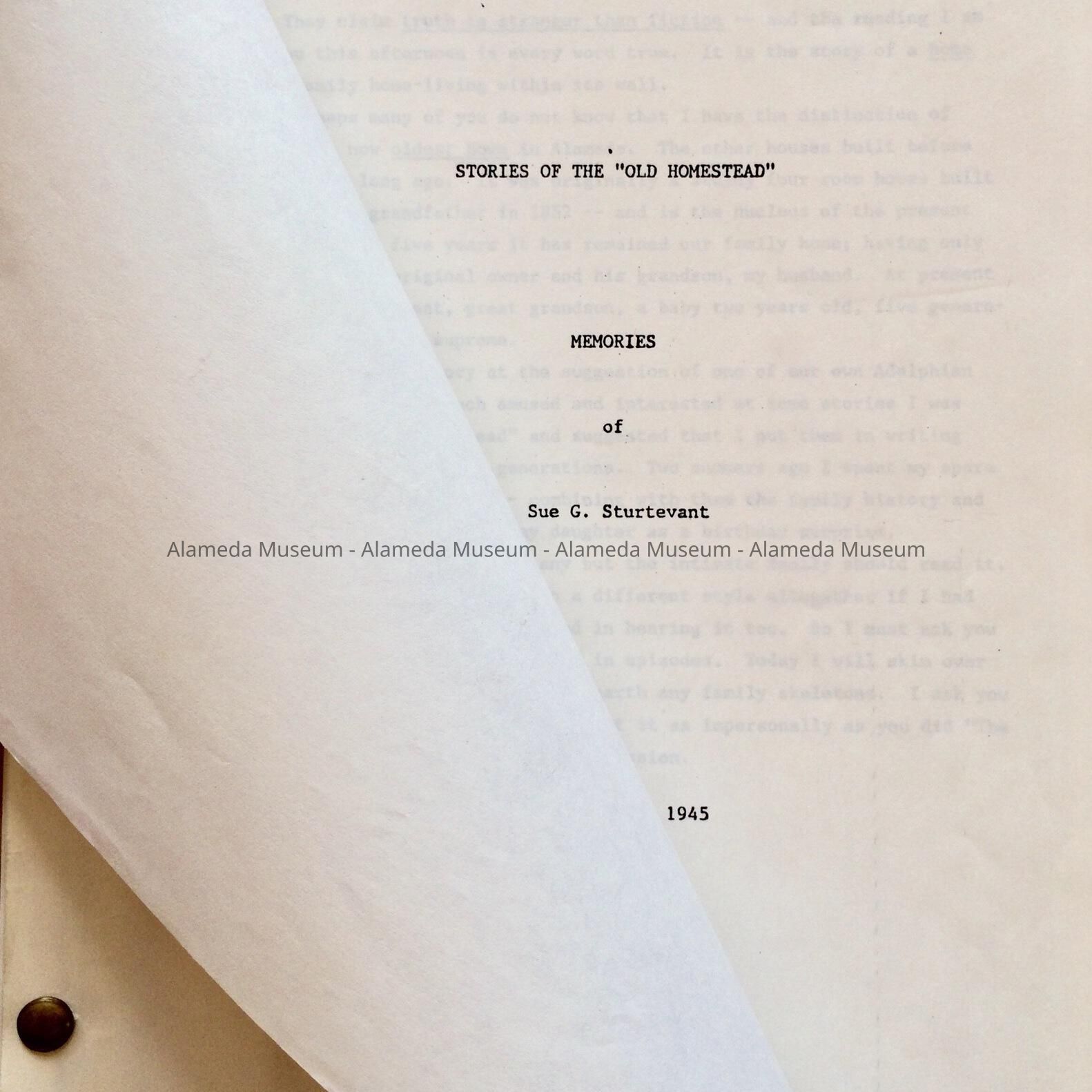 ESSAY ENTITLED, "STORIES OF THE OLD HOMESTEAD," WRITTEN BY SUE G STURTEVANT. MRS STURTEVANT MARRIED INTO THE WEBSTER FAMILY OF 1238 VERSAILLES STREET, ALAMEDA, THE OLDEST DOCUMENTED HOUSE IN THE CITY OF ALAMEDA, ERECTED IN 1854. THE AUTHOR WAS THE FORMER SUZIE GARDINER HAND, WHO MARRIED GEORGE STURTEVANT, GRANDSON OF J N WEBSTER, ORIGINAL OWNER OF 1238 VERSAILLES STREET.