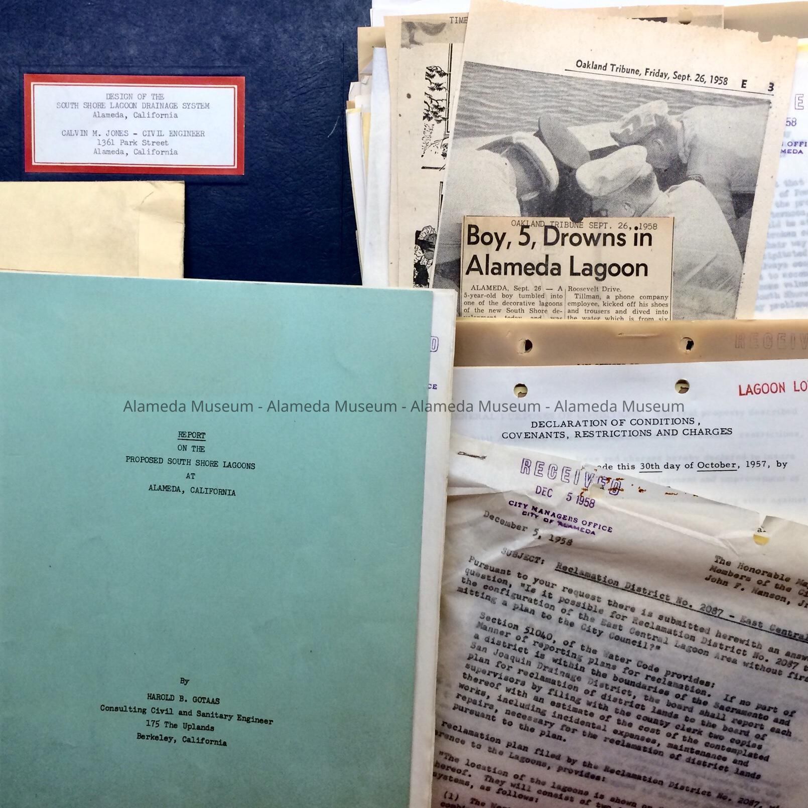 Documents found in the attic of City Hall, prior to renovations. These documents were originally in a folder (discarded in 2011) with a green label on the tab stating: "Lagoon System 1956-58 South Shore Planning + Acceptance (Gotaas Report)”. Documents in this folder include: Report by Civil Engineer Calvin Jones, and Report (2 copies) of Report by Harold B. Gotaas of Jones’ report; Maps; Newspaper clippings (including one of a boy drowned in 1958); requests for docks (as soon as the lagoons were constructed) and concerns about those causing obstructions. Includes letter from Utah Construction stating they would absorb all costs. One letter suggests turning the shore of the lagoons into a nice walking path. Also includes a transcript of the planning board, which included Miss Meyers.