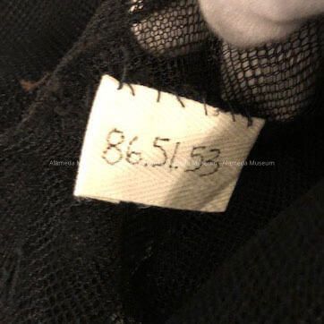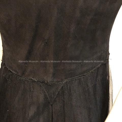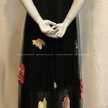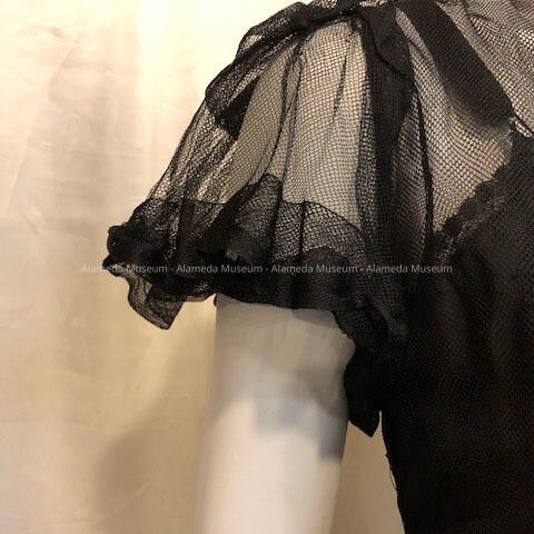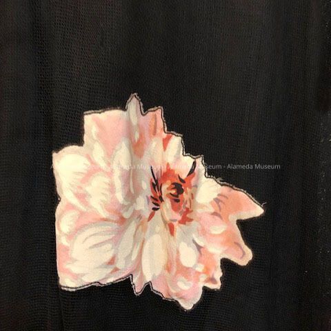 Description: Evening dress of black netting (full skirt with applique colored flowers of crepe), with puff sleeves and V-neck front, Missing slip.
