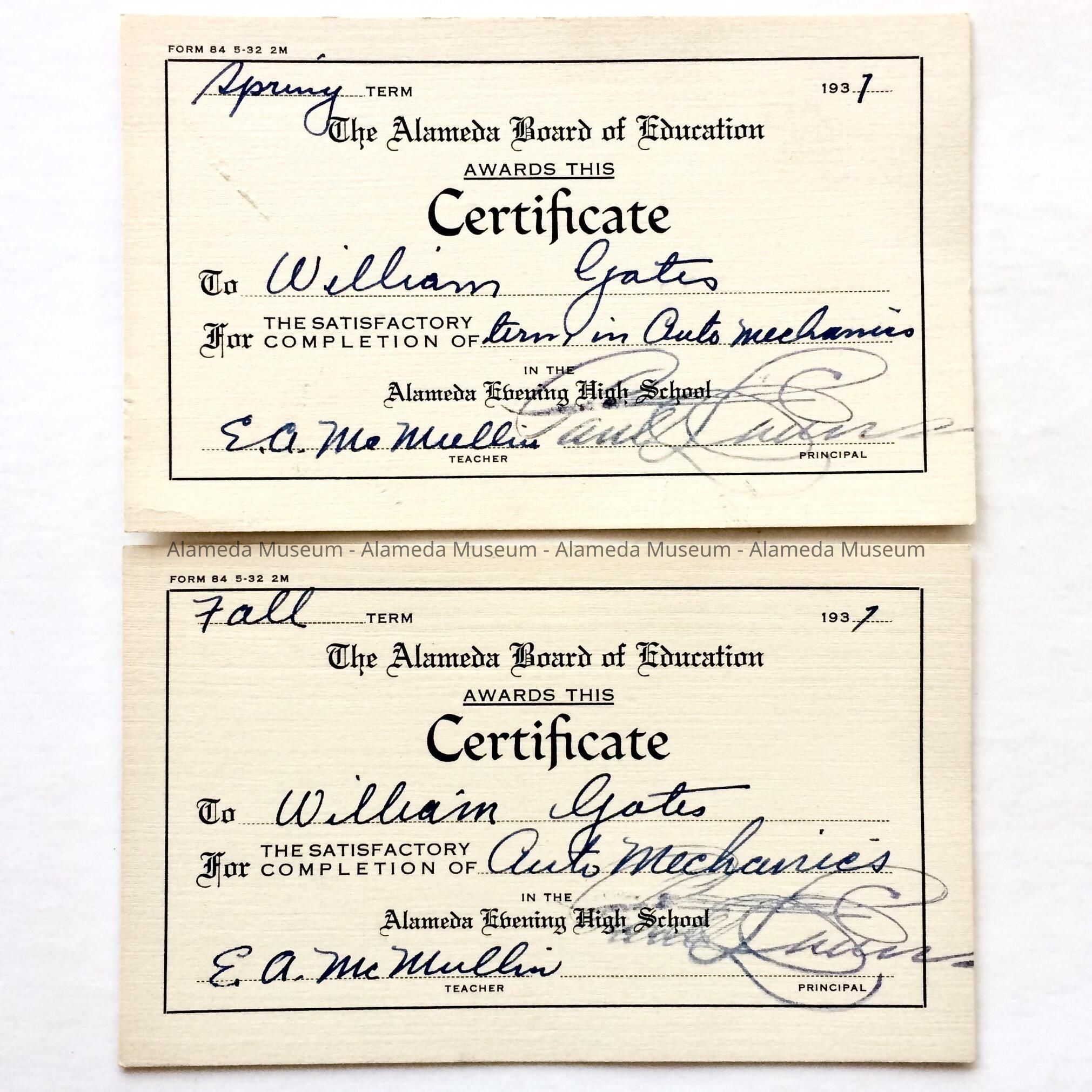 HISTORY OF OBJECT: A SPRING AND FALL CERTIFICATE ISSUED IN 1937 BY THE ALAMEDA BOARD OF EDUCATION TO WILLIAM GATES FOR COMPLETION OF AN AUTO MECHANICS CLASS IN THE ALAMEDA EVENING HIGH SCHOOL.