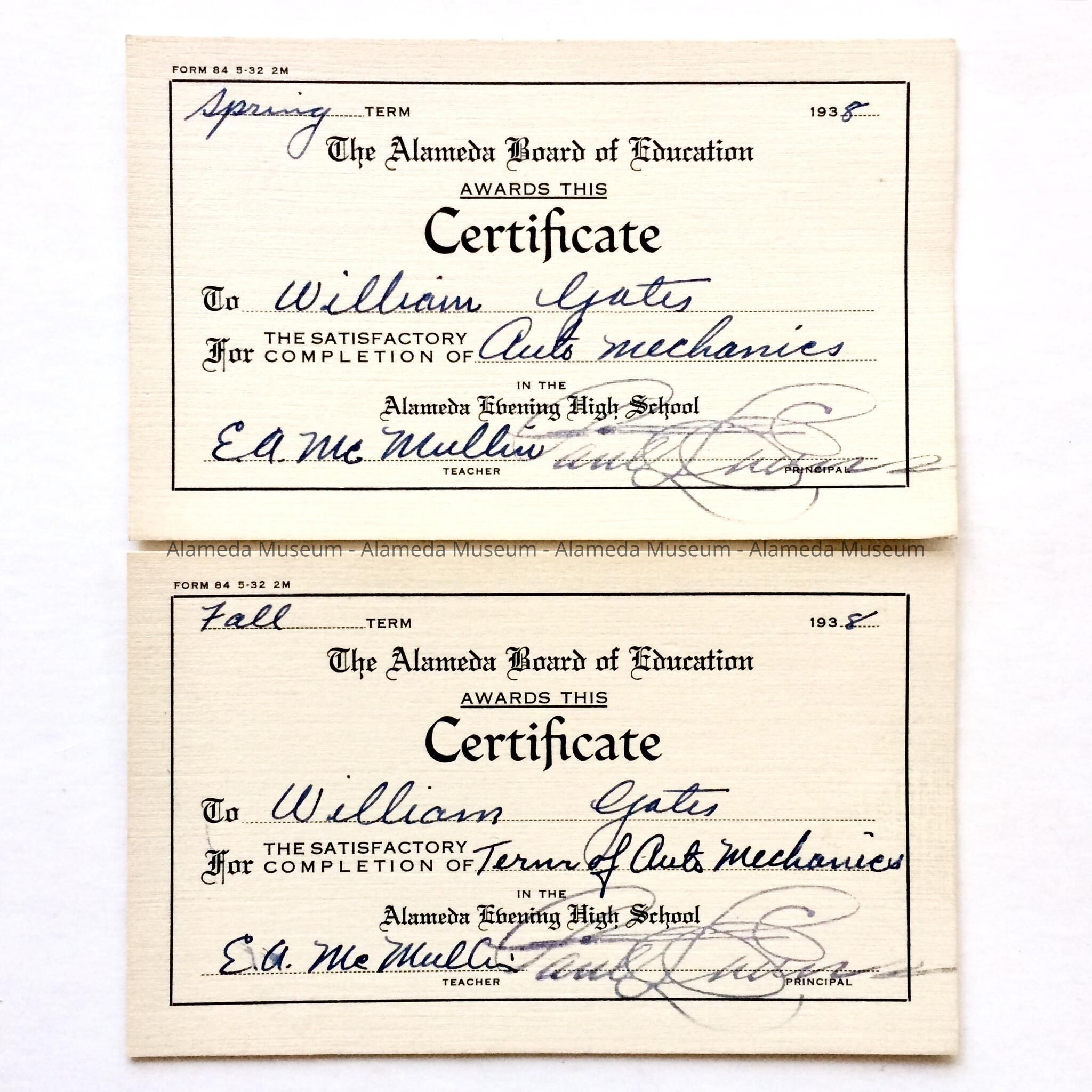 HISTORY OF OBJECT: A 1938 SPRING AND FALL CERTIFICATE ISSUED BY THE ALAMEDA BOARD OF EDUCATION TO WILLIAM GATES, ALAMEDA EVENING HIGH SCHOOL.