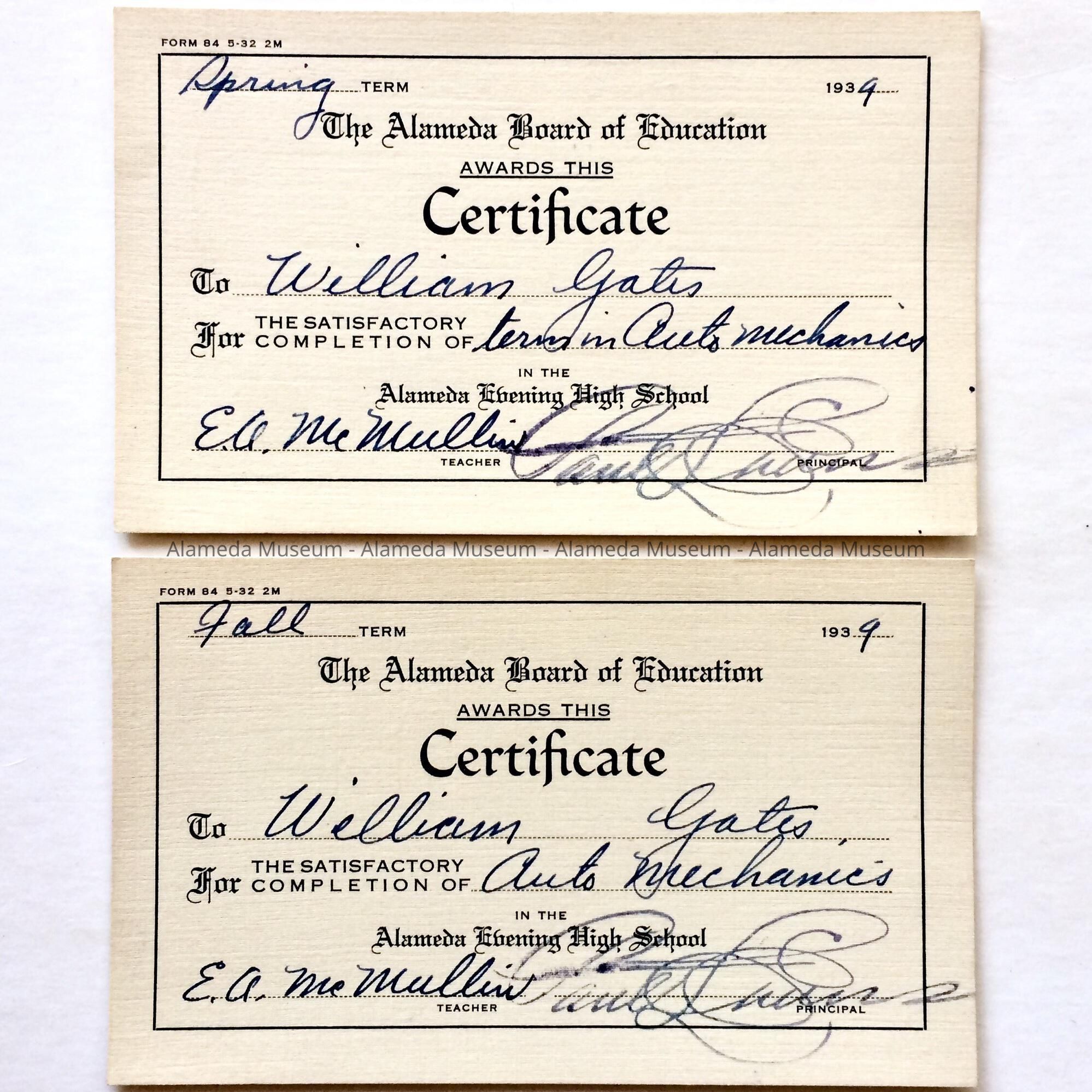 HISTORY OF OBJECT: SPRING AND FALL 1939 CERTIFICATES ISSUED BY THE ALAMEDA BOARD OF EDUCATION, TO WILLIAM GATES FOR COMPLETION OF A MECHANICS CLASS IN THE ALAMEDA EVENING HIGH SCHOOL.