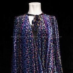 Evening jacket of multi-colored confetti design (velvet effect) on deep blue colored georgette. Self tie. Jacket fastens at hem.