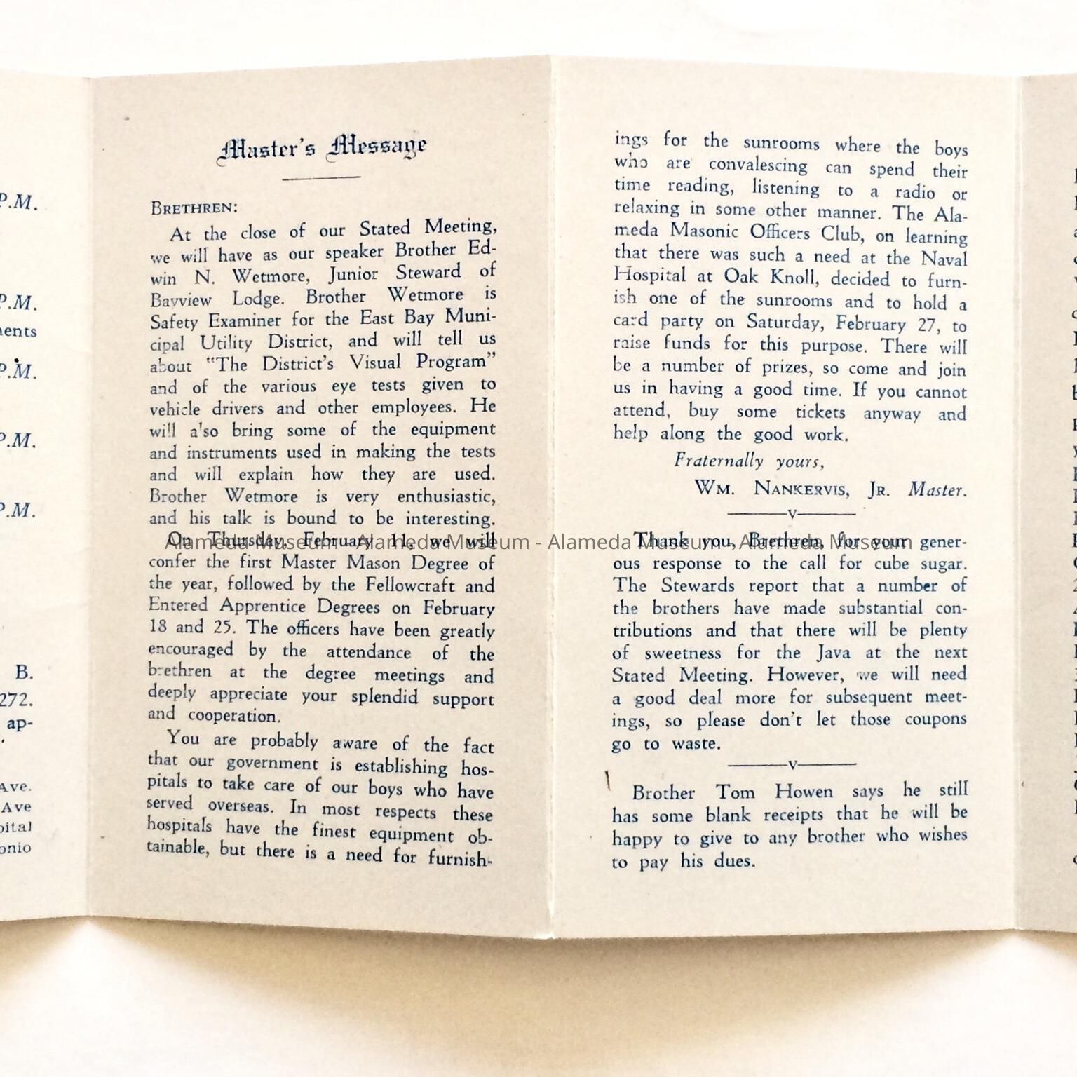 HISTORY OF OBJECT: PROGRAM FOR FEBRUARY, 1943. ISSUED DURING TERM OF Wm. NANKERVIS AS MASTER OF LODGE.