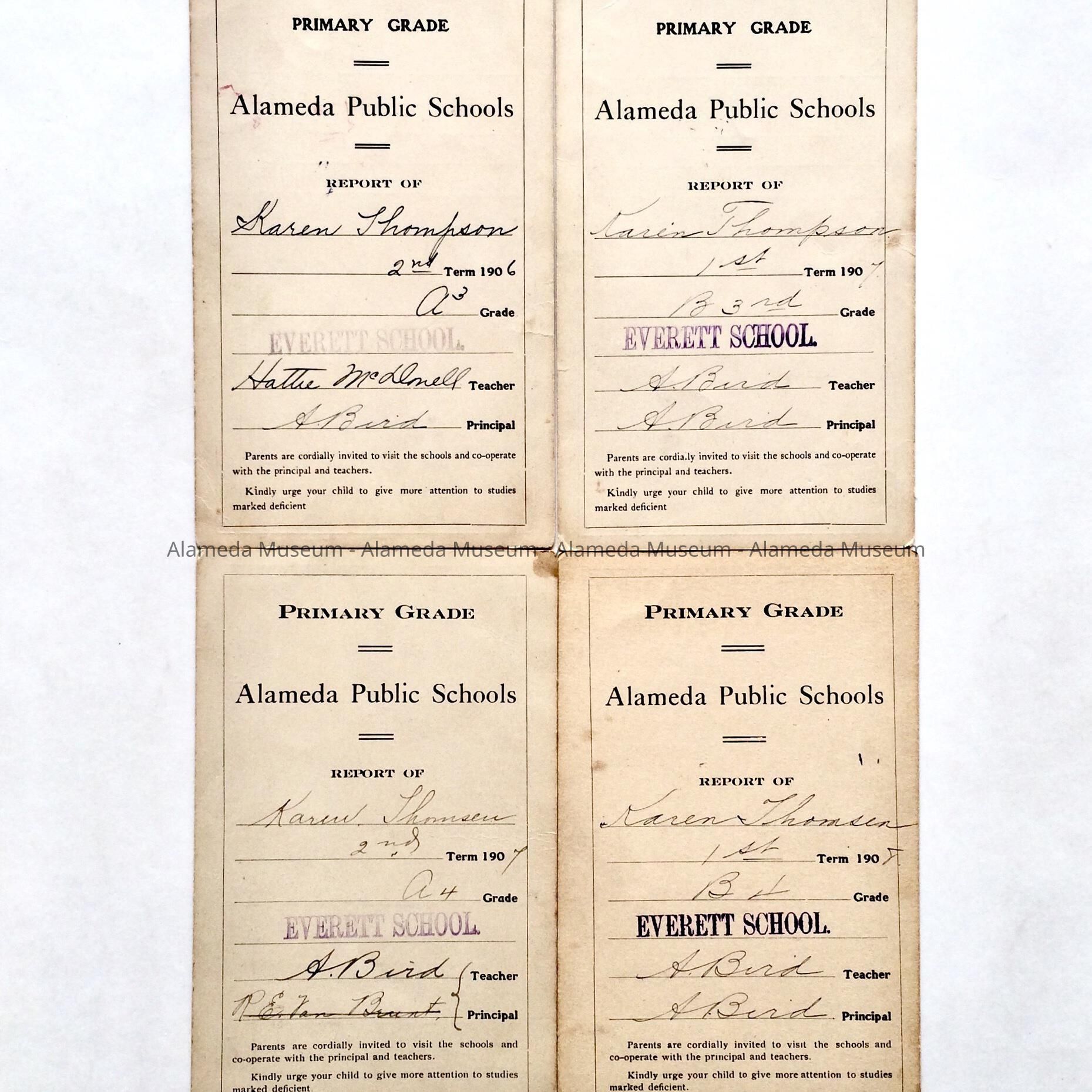 REPORT CARDS FOR KAREN THOMSEN FOR FIRST AND SECOND GRADES AT EVERETT SCHOOL, 1907 THRU 1908, FOR UPPER AND LOWER SECOND GRADE. THE SCHOOL IS NO LONGER IN EXISTENCE.
