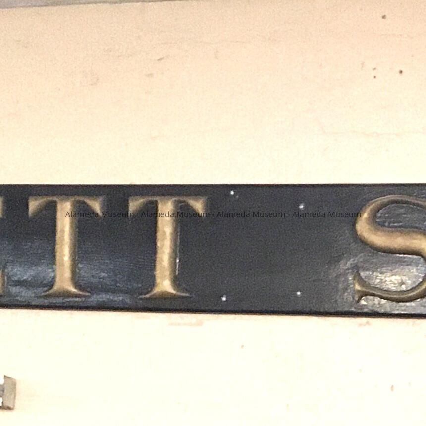 It is a solid wooden panel on which are nailed thirteen letters, nine inches tall. The letters are mounted on this oblong wooden black painted board. The letters are painted gold.