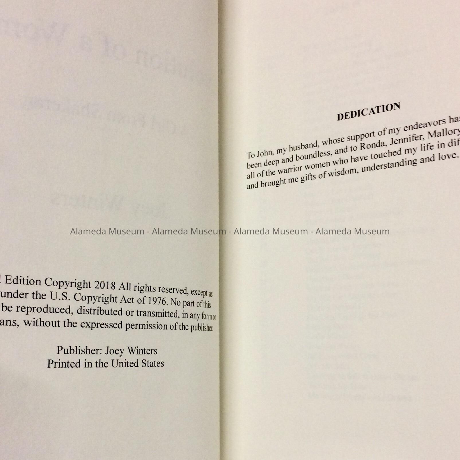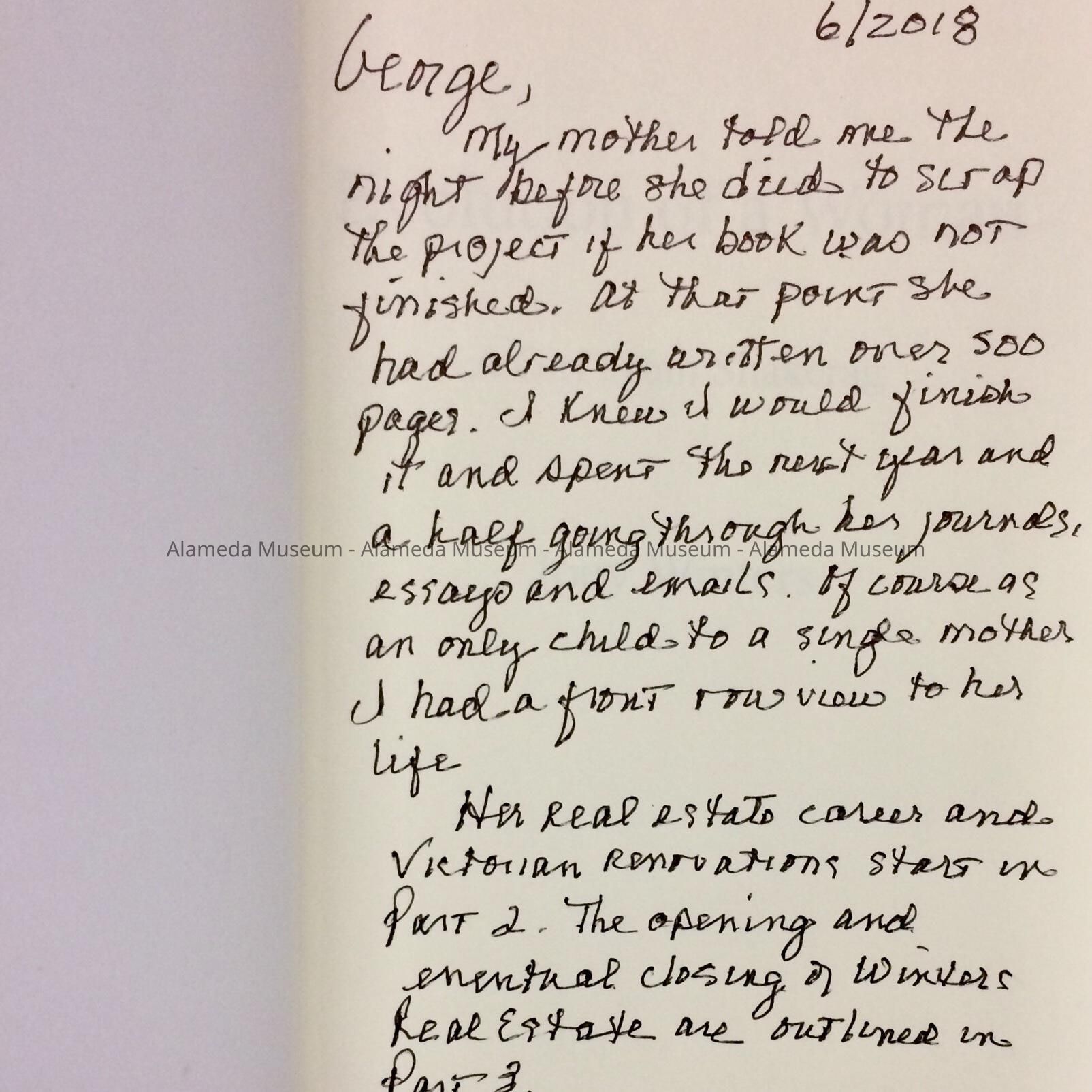 History of Object: A 678 page biography of Joey Winters, who was a prominent real estate agent and property owner in Alameda. This book was begun as an autobiography by Mrs. Winters, but she died before it was completed; so, her daughter Rhonda Downey completed the work.