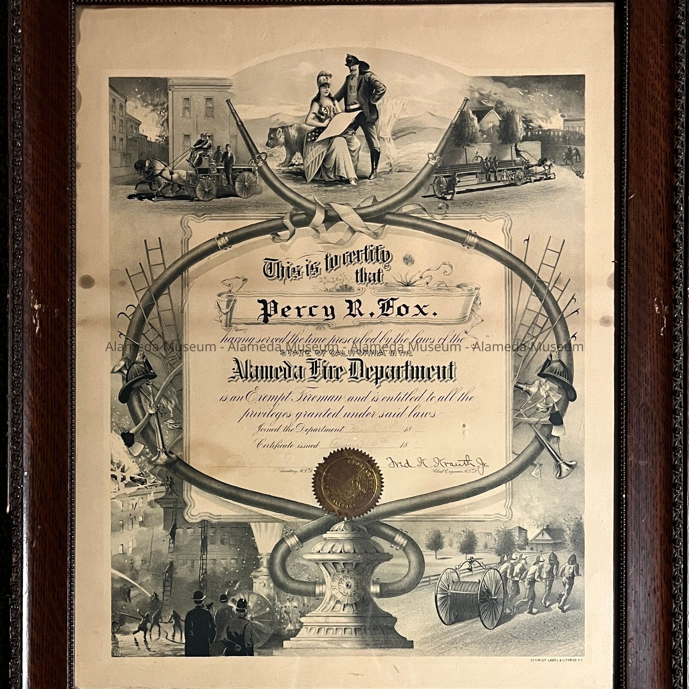 History: Certificate awarded to Percy R. Fox as Exempt Fireman by the laws of the state of California, issued by the Alameda Fire Department for the period March 5, 1896, signed August 9, 1904 by Fred K. Krauth, Jr., Chief Engineer A.P.D. The Certificate signaled the end of the volunteer fire companies, and as exempt fireman, Fox was free of jury duty - until that state law changed in 1905.