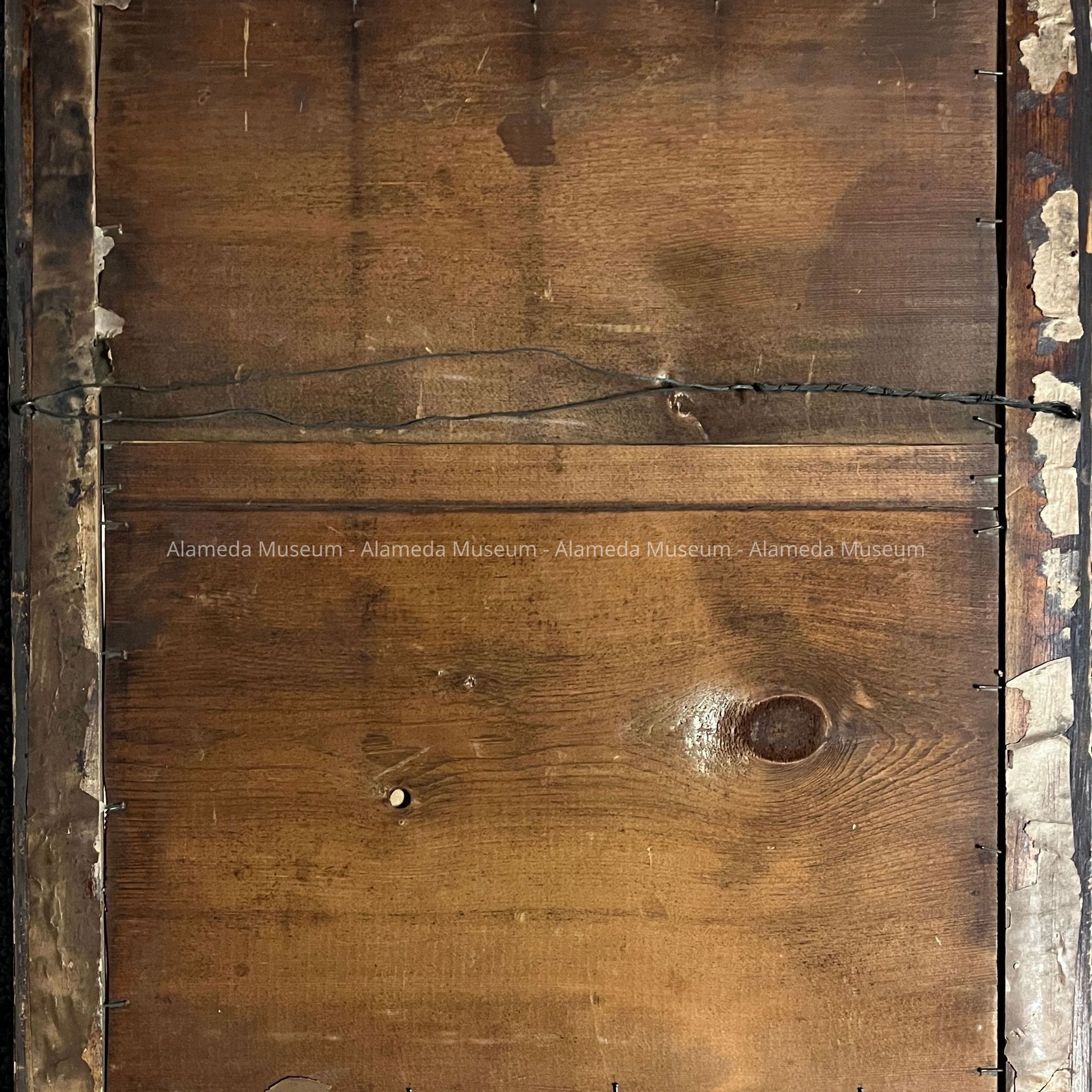 Behind glass, in original dark wood frame with gesso decoration strips. Backing consists of two wood boards.
