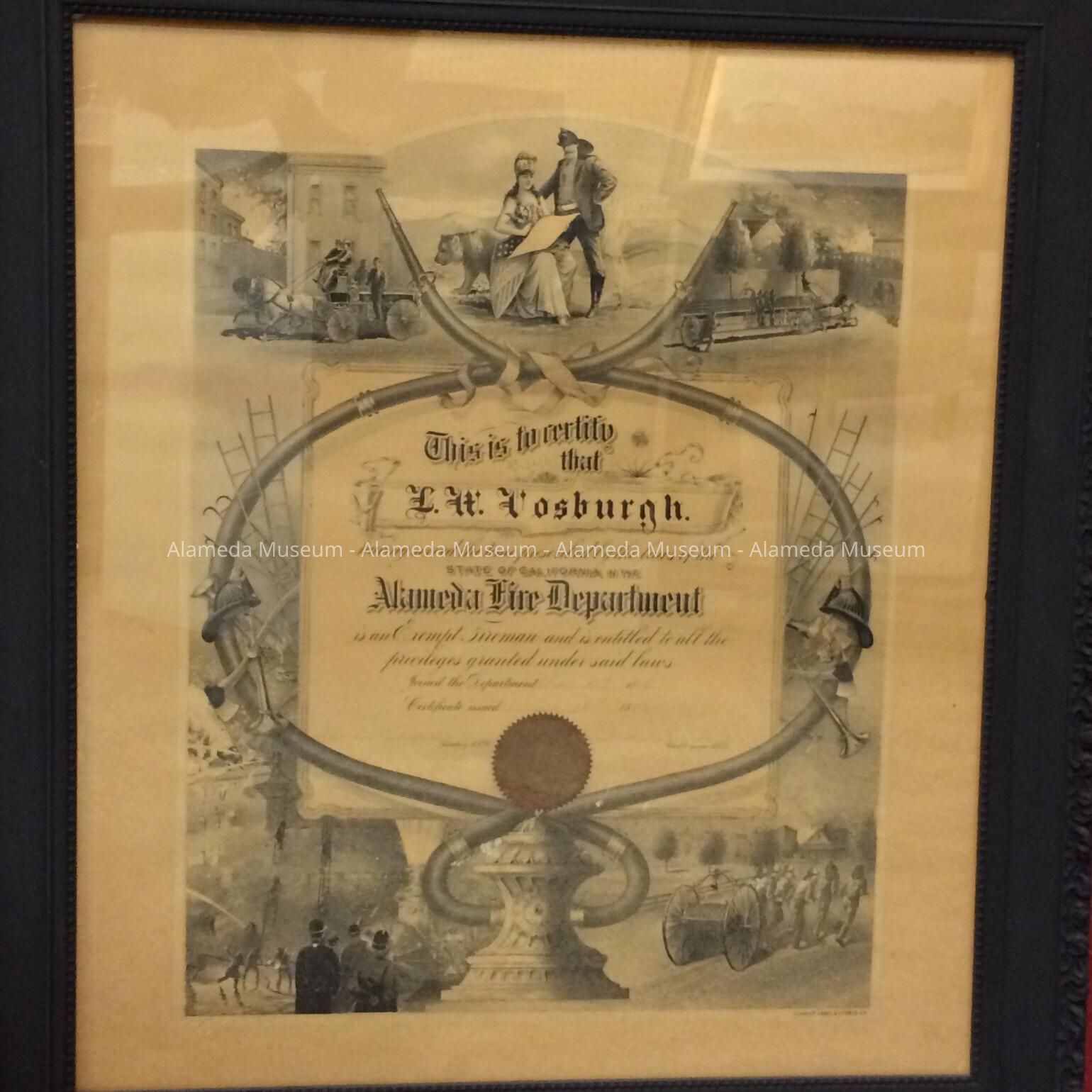 History of Object: Certificate awarded to Lew W. Vosburgh for serving as an exempt fireman, Alameda Fire Department. He joined the department on Nov. 4, 1886 and this certificate was issued Mar. 16, 1892. He was also the treasurer of the J. V. Vosburgh Hardware Company located on Park Street.
