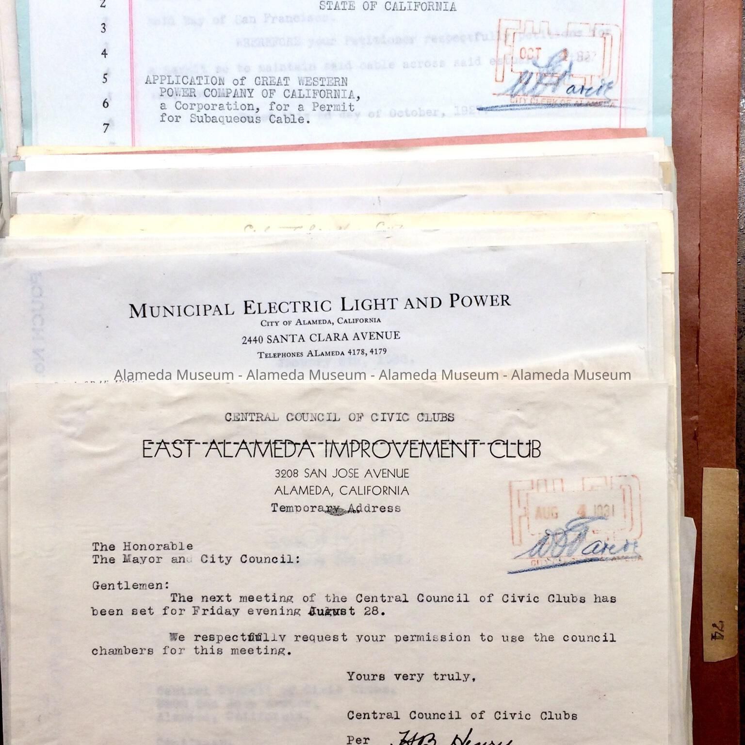History of Object: Expanding Folder, found in the attic of City Hall prior to renovations in the 1990s. Documents in this ‘Pouch’ pertain to the Board of Utilities, including transfer of assets to the Electric Light Plant to the Great Western Power Company, and reinstating of a municipal electricity company; transfer of ownership of the Alameda Belt Line to be shared by the Santa Fe, Western Pacific, and Southern Pacific Railroads (74-18: Report includes history of the Belt Line; 74-33: Brief regarding the Belt Line by City Attorney Wm. J. Locke; 74-40 Agreement). Documents include assignment of members of the Board of Public Utilities (e.g. Hermann Krusi, e.g. 1927, 74-46); and various miscellaneous matters, such as Christmas lights for Park Street (74-87); Key System Transit Co. changes (e.g. 74-83); contract with Carl Werner, architect, to design a Public Utility Building (between 74-49 and 74-48).