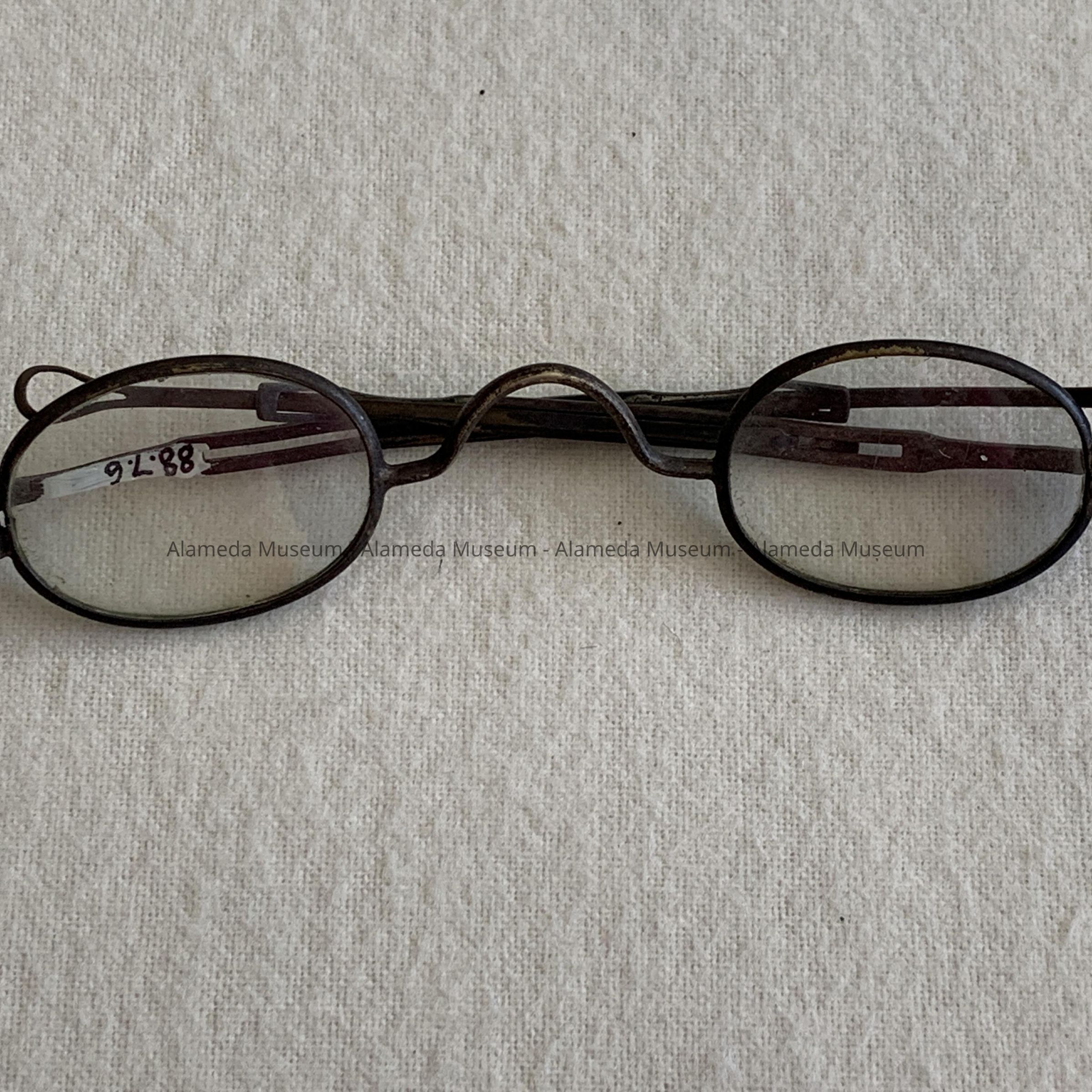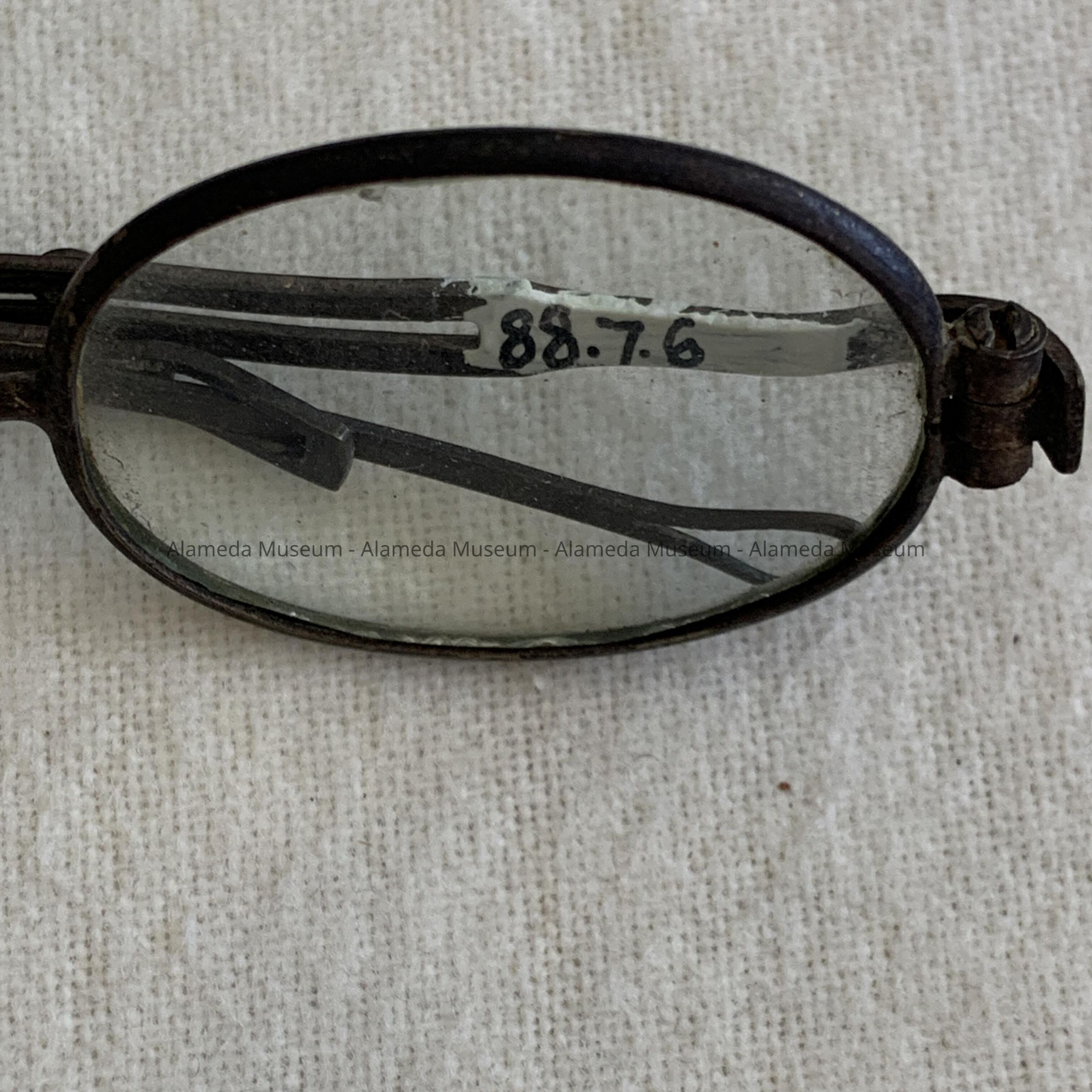 History of Object: Eyeglasses worn by an unidentified member of the Thomas family, 1405 Caroline St., Alameda. The Thomas family are old-time residents of the community.