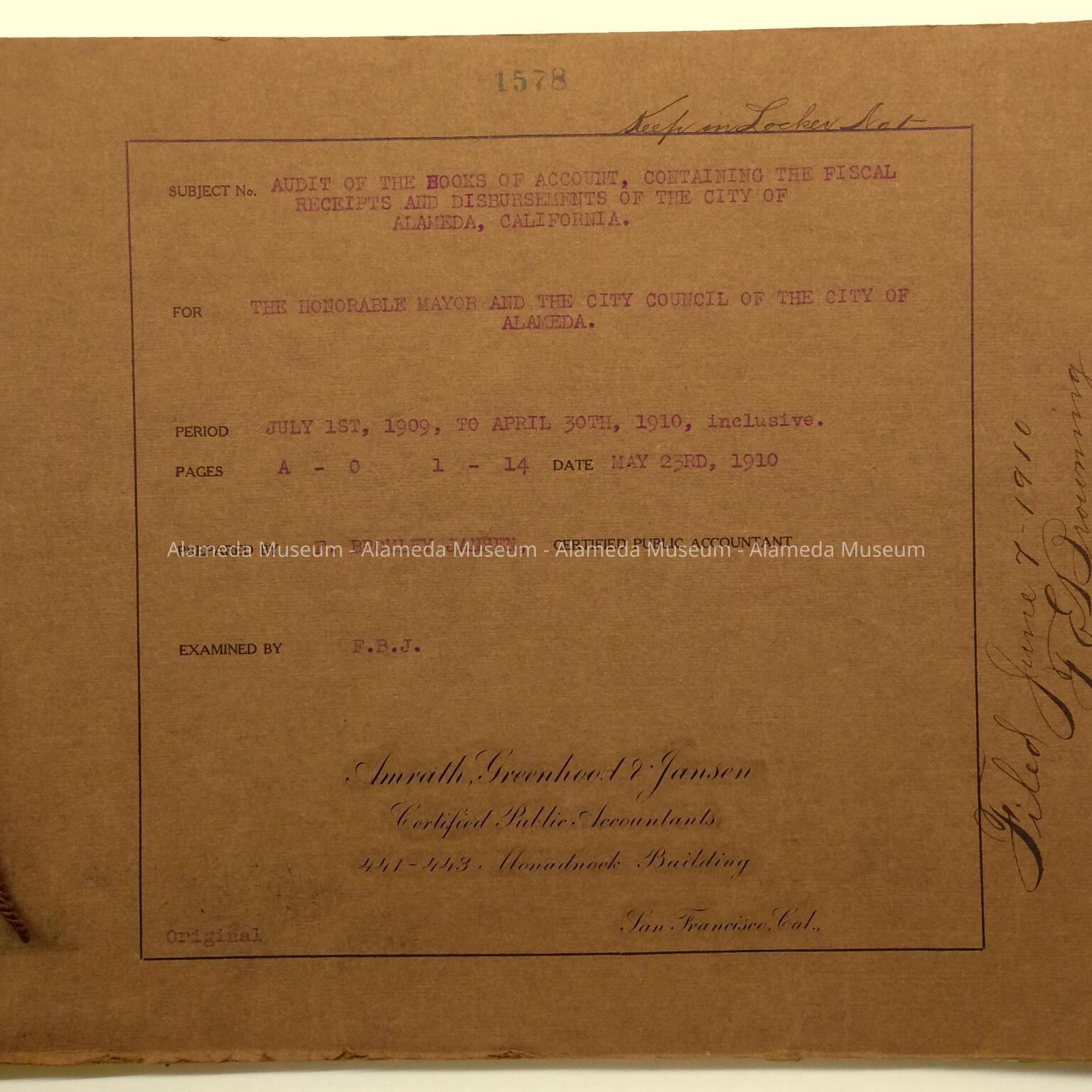Description: Heavy card stock loose leaf brown cover, tied with brown cord. Cover states: ‘Audit of the Books of Account, Containing the Fiscal Receipts and Disbursements of the City of Alameda, California’, ‘For the Honorable Mayor and the City Council of the City of Alameda’. Period July 1, 1909, to April 30th, 1910. Prepared by F. Bromley Jansen, Amrath Greenhood & Jansen CPAs. Filed June 7, 1910, F. E. Browning, City Clerk. Stamped with number 1578.
