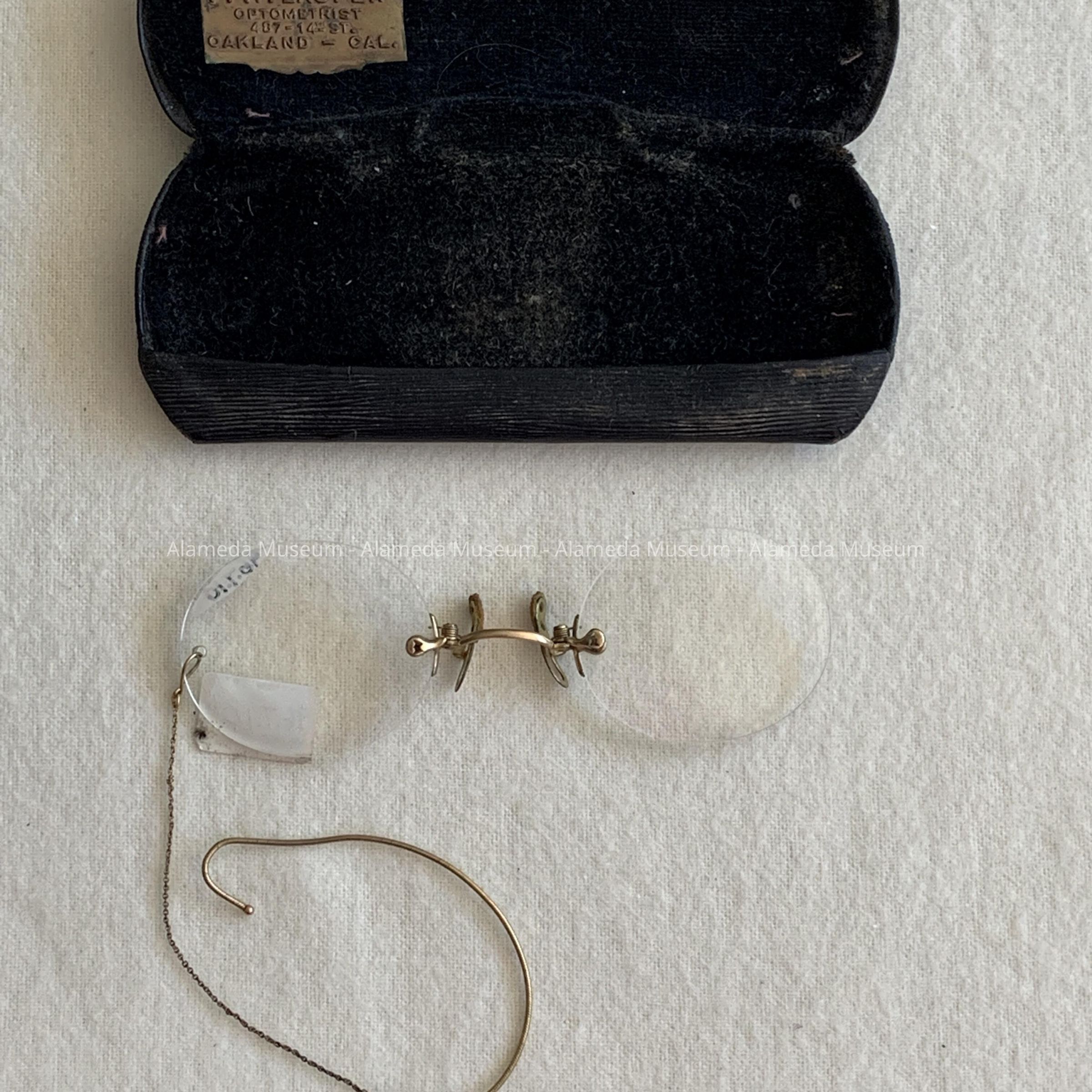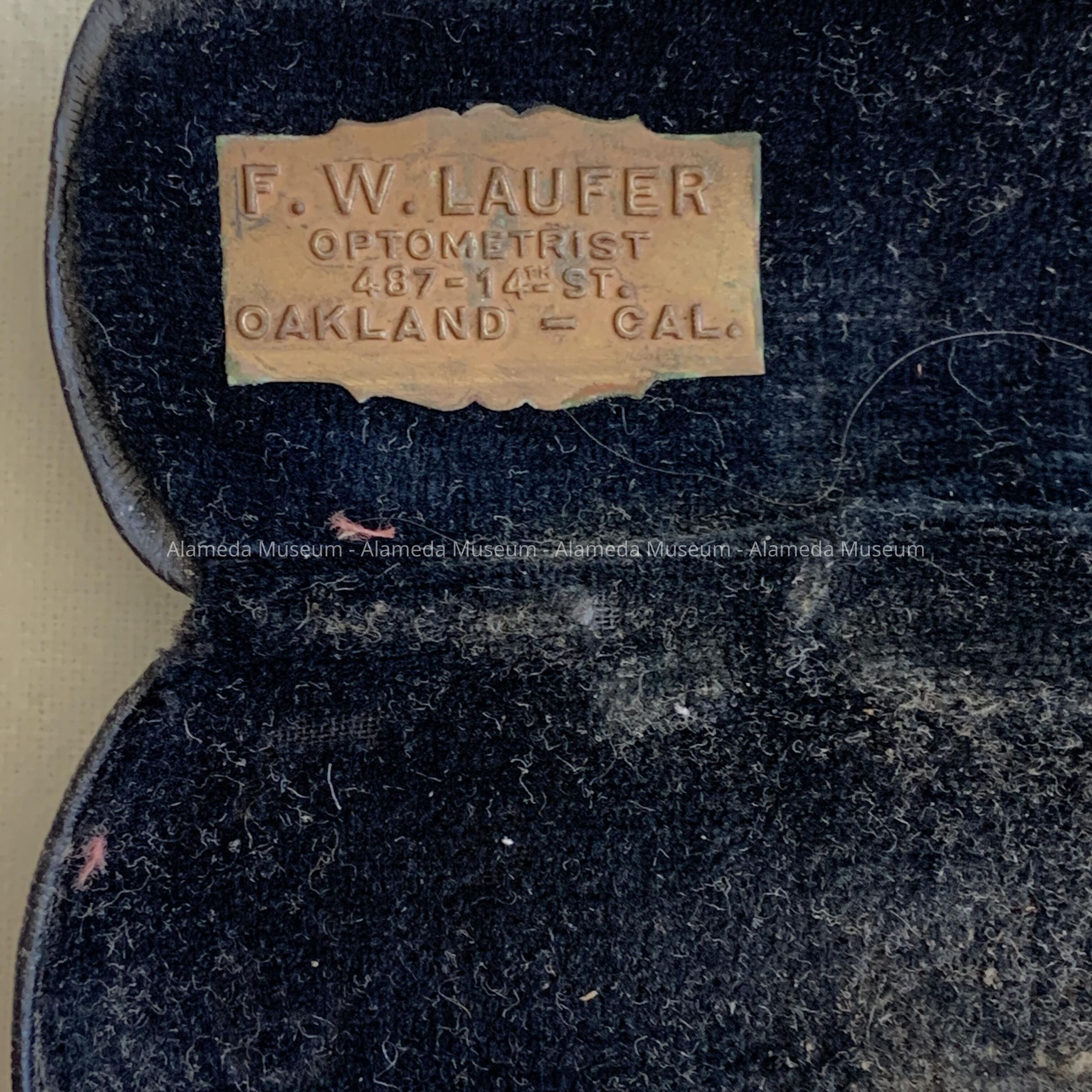 B. OBLONG-SHAPED EYE GLASS CASE. EXTERIOR IMITATION BLACK COLORED LEATHER. INTERIOR LID WITH BLACK VELVET. INTERIOR LID OF CASE HAS A GOLD LABEL STATING, "F. O. LAUFER, OPTOMETRIST, OAKLAND, CALIFORNIA.".