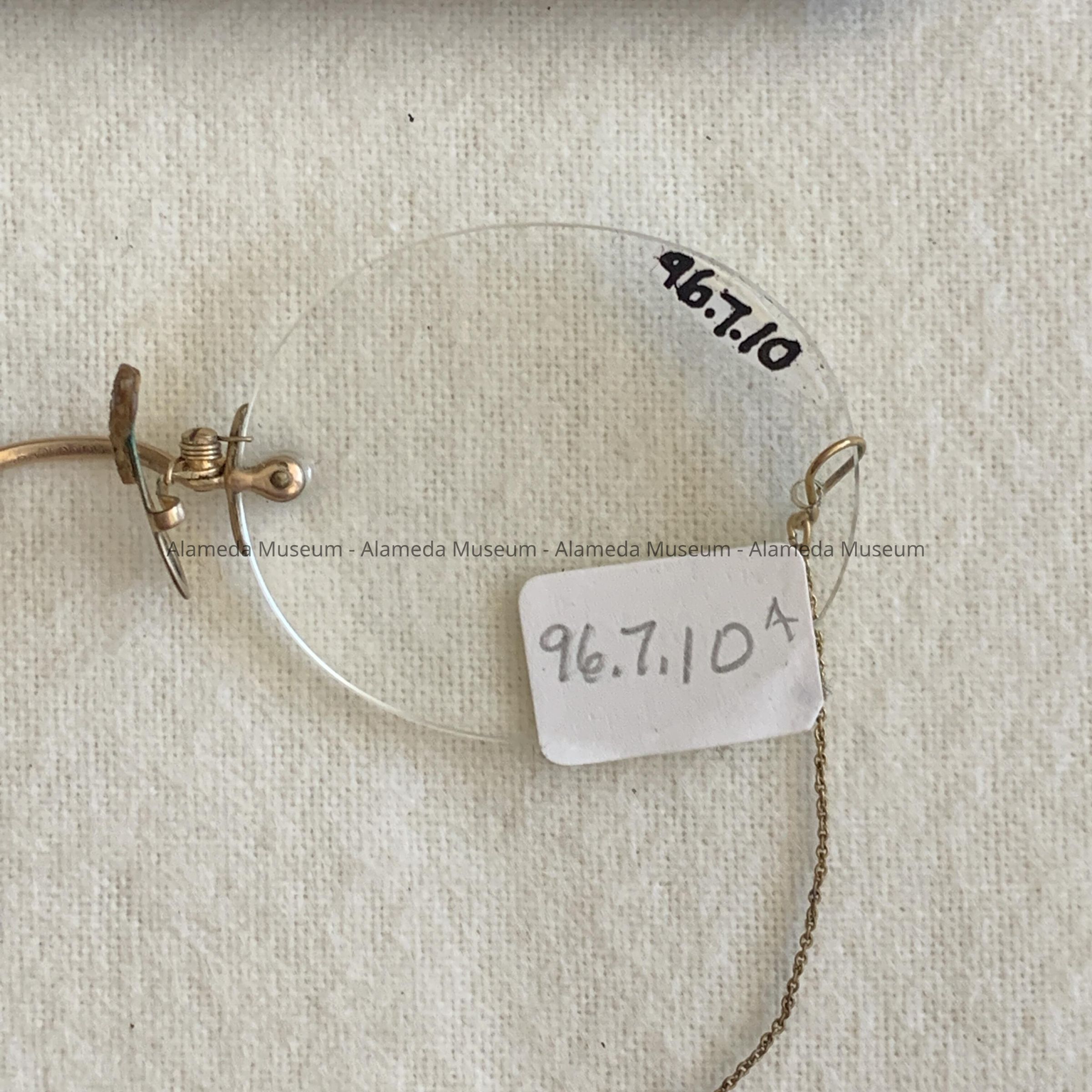 A. PINCE-NEZ STYLE FRAMELESS EYE GLASSES, ATTACHED TO OVAL SHAPED LENS. GOLD CHAIN WITH EAR MOUNT WHICH SECURES GLASSES FROM FALLING.