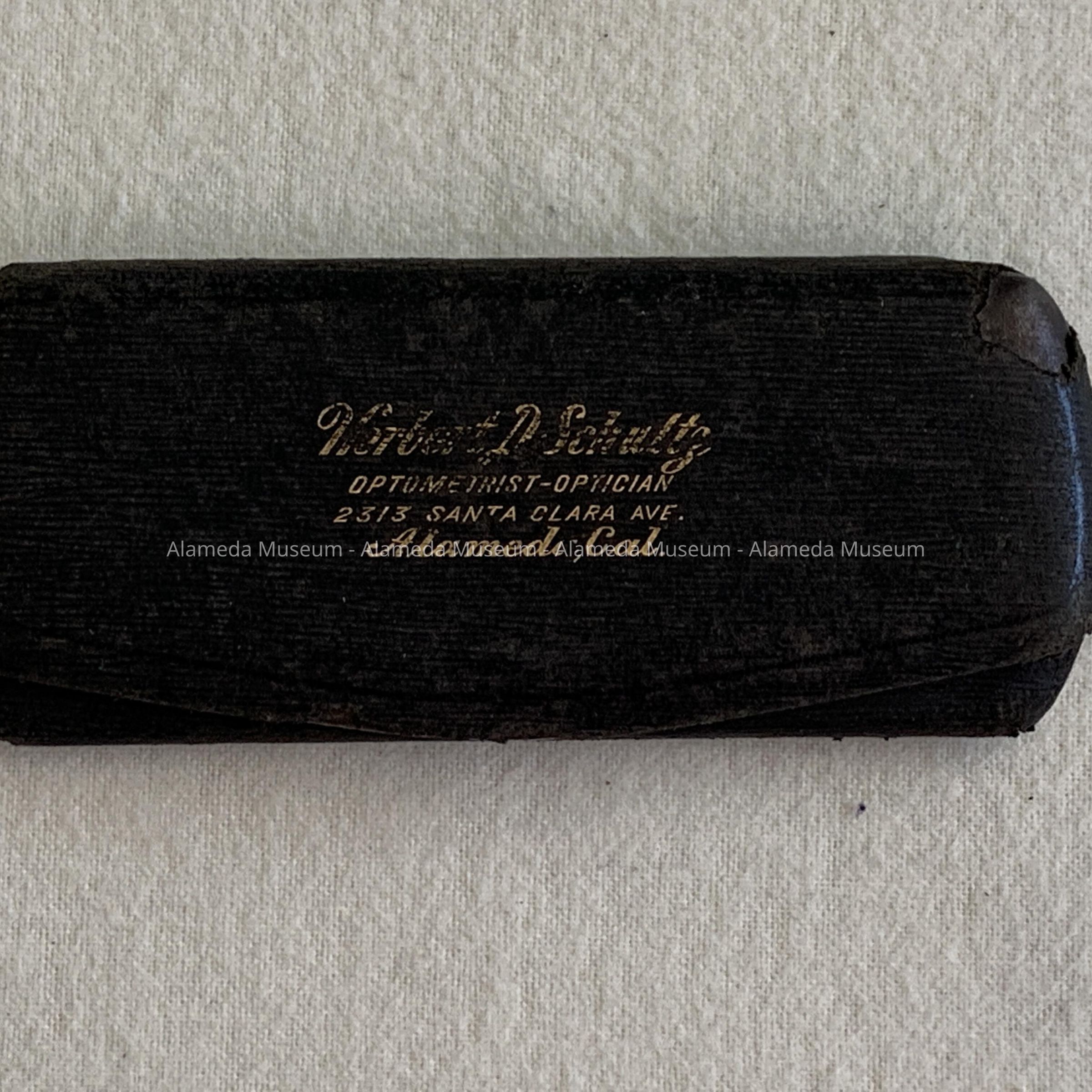 Black imitation leather covered case with incised gold lettering stating "Herbert D. Schultz, 2313 Santa Clara Ave., Alameda, Cal."