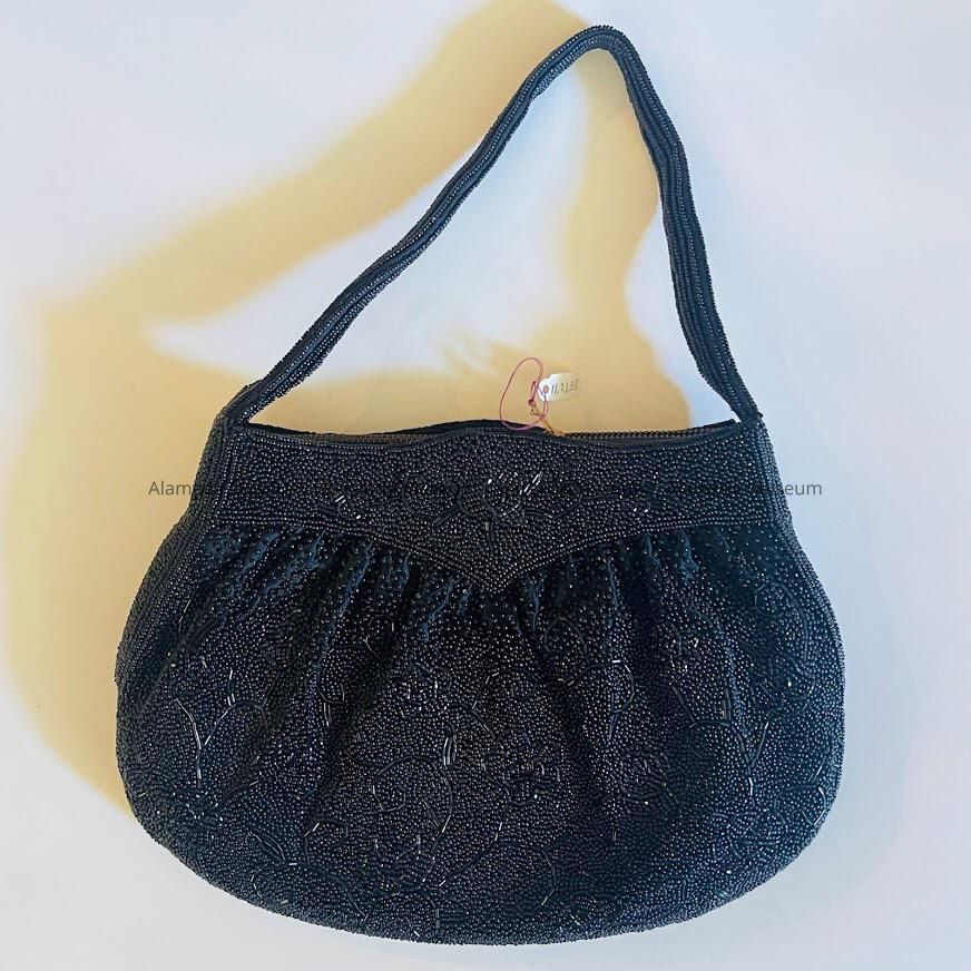 Description: A fabric evening bag covered with black-colored beading. The beaded design consists of stylized flowers on a field of round shaped black colored beads. The interior is lined in black colored satin with a zipper pocket. The pocket has an embroidered label that states, "Guaranteed Handmade." The purse is supported by a beaded fabric strapped handle.