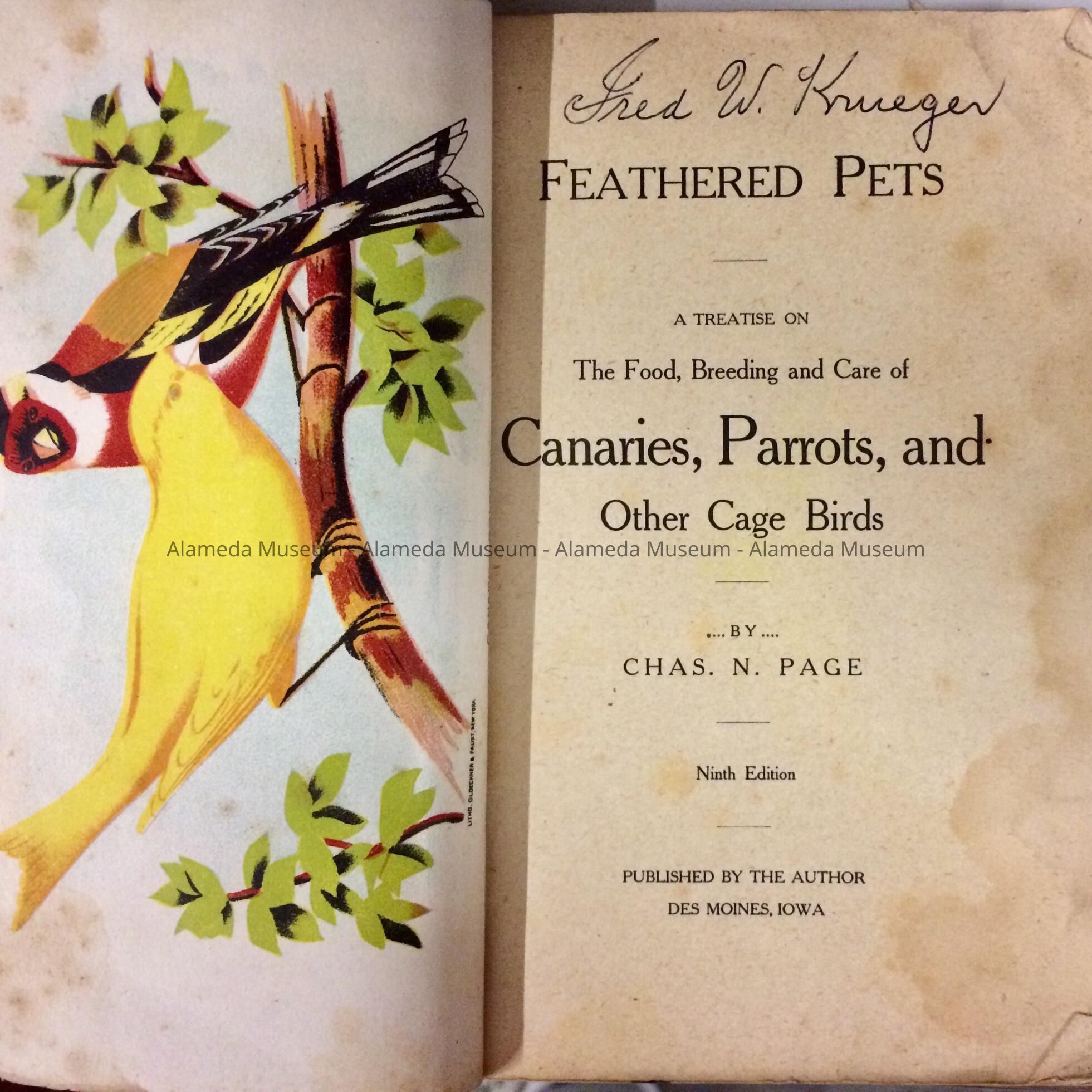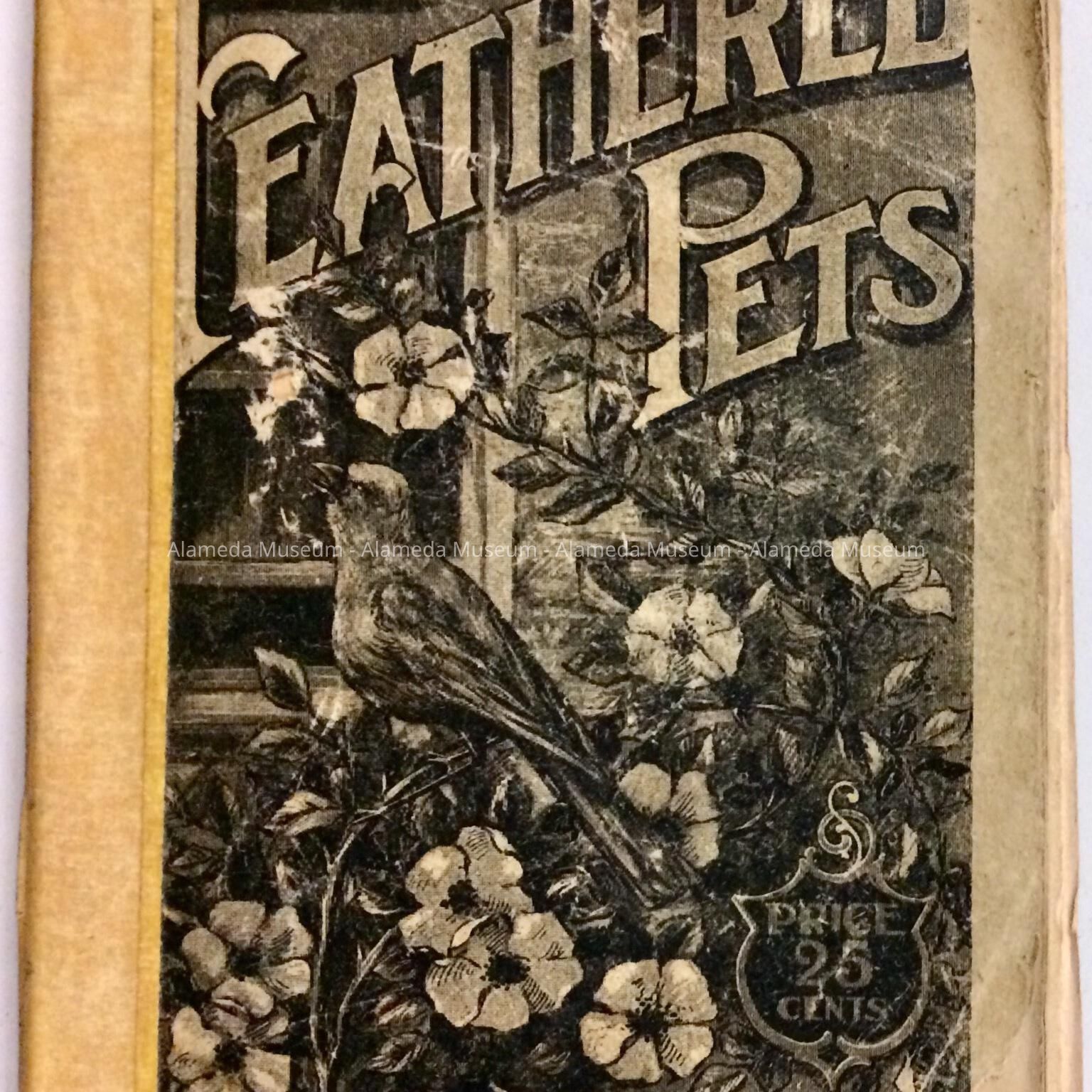 Soft cover book with black & white illustrated cover design (bird & flowers) & bold printed caption "Feathered Pets." Author, Chas. N. Page, published by the author, Des Moines, Iowa, 1898.
