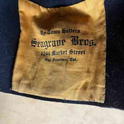 Description: black felt fez with off-white top tassel and embroidered: 'Sciots', and a pyramid with the number 8. Inside is a yellow cotton label with printed in black gothic type: ‘Up-town Hatters, Seagrave Bros.’