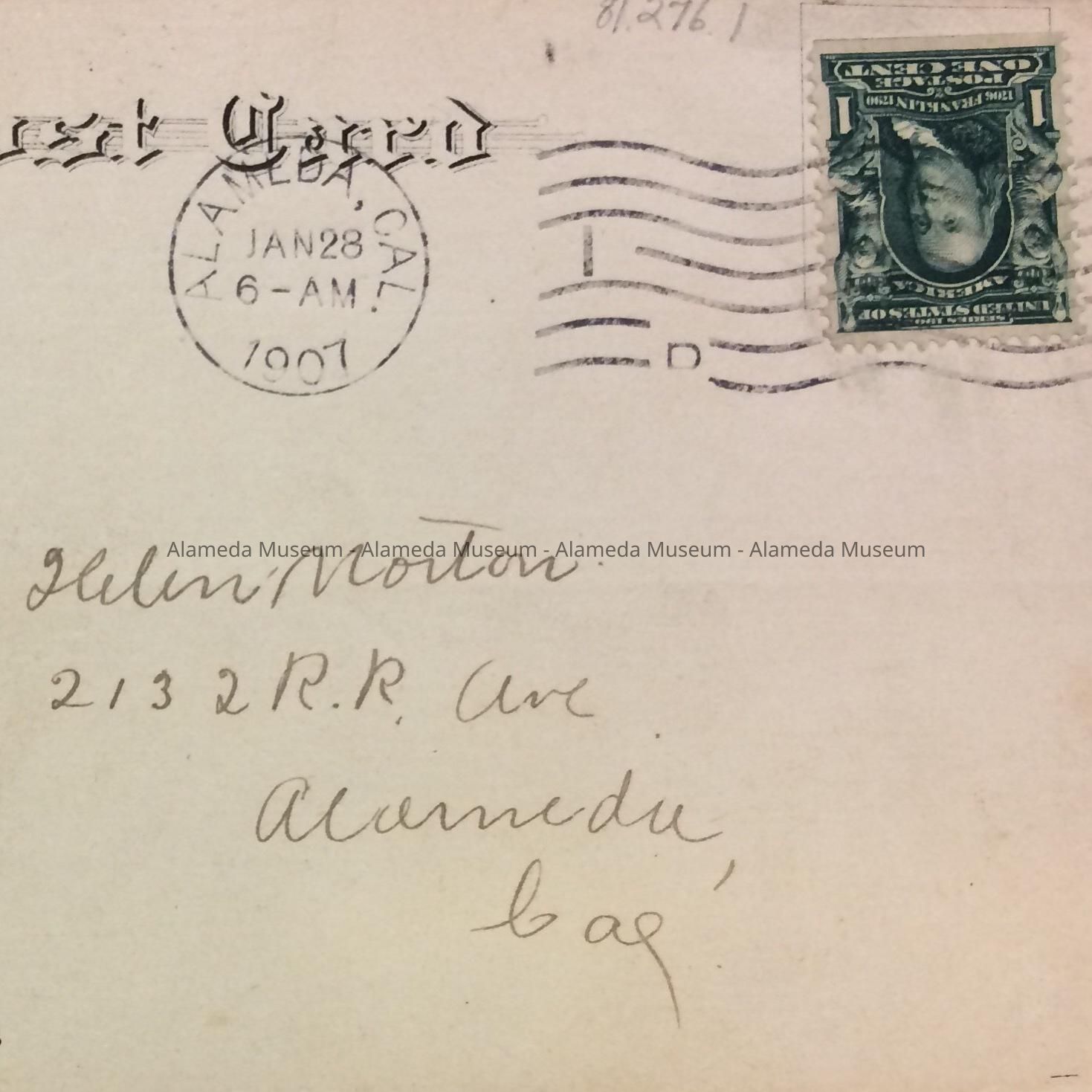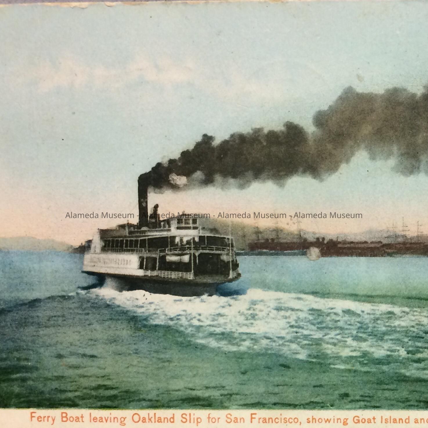 History of Object: Postcard depicting ferryboat on its route to San Francisco. It was sent in Alameda to Miss Helen Norton, 2132 R.R. Avenue, Alameda, California.