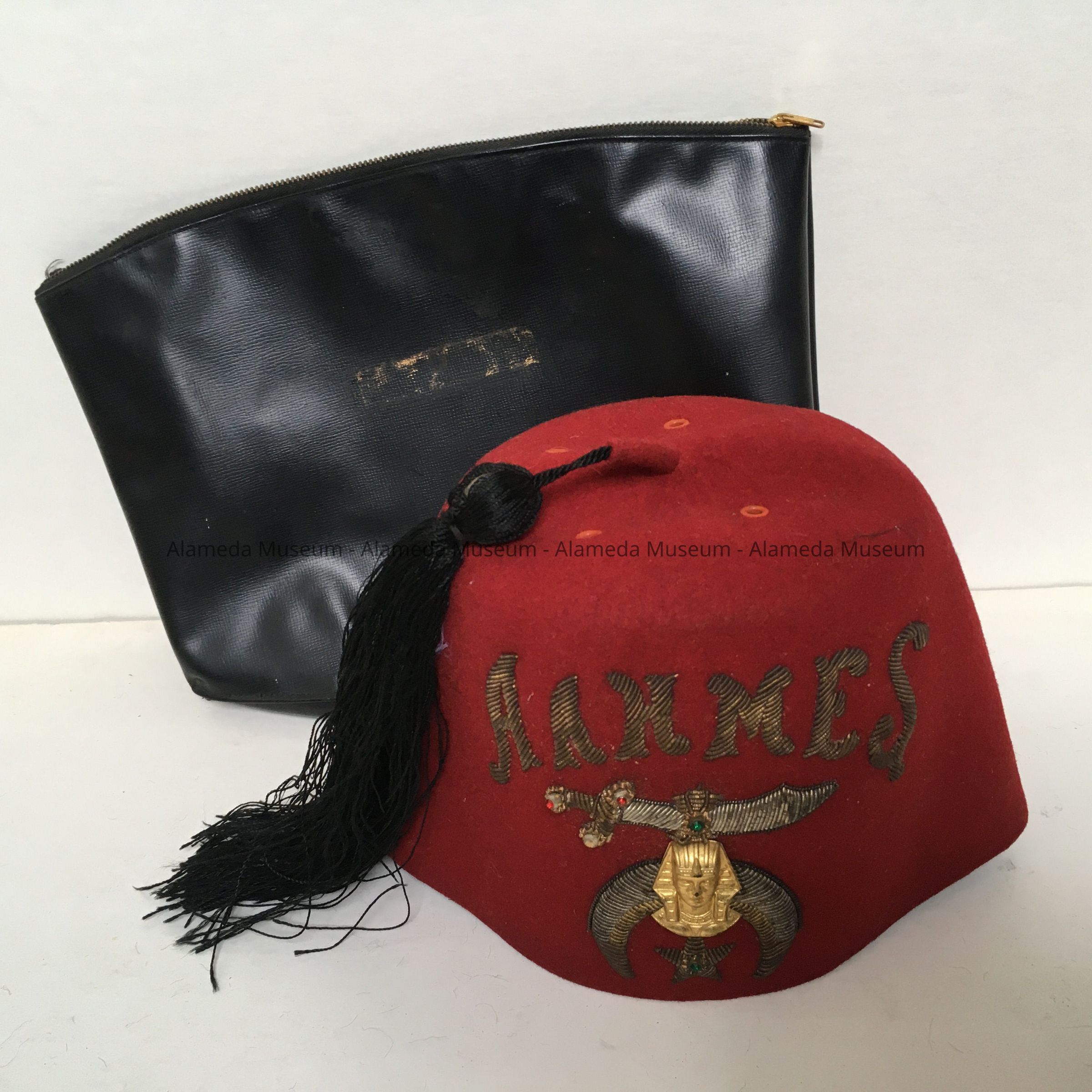 A: Fez made of a heavy maroon-colored felt with a black silk tassel. Fez has initials AAHMES embroidered in gold metallic thread above an embroidered design composed of a scimitar from which is hanging a gold metal Egyptian bust in full head dress superimposed on a crescent.